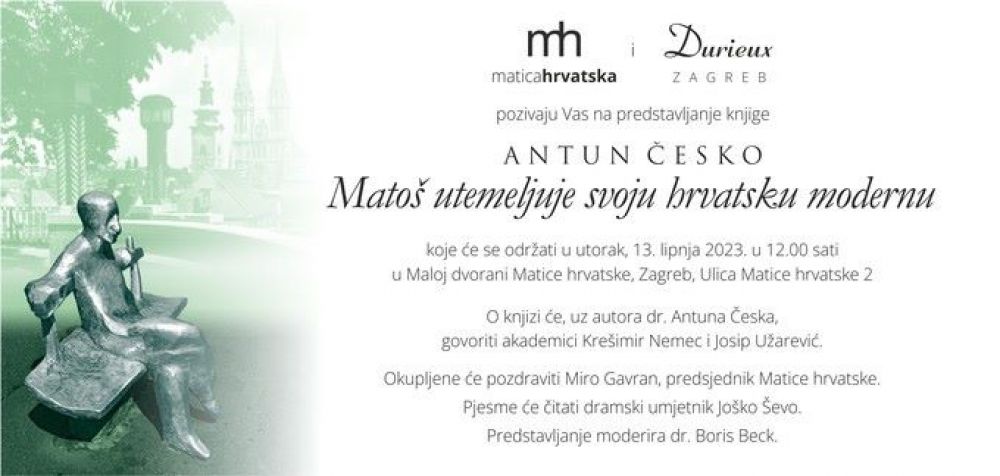 Utorak, 13. lipnja u 12 sati, Mala dvorana Matice hrvatske, Ulica Matice hrvatske 2, Strossmayerov trg 4, Zagreb,O knjizi će, uz autora dr. Antuna Česka, govoriti akademici Krešimir Nemec i Josip Užarević. Okupljene će pozdraviti Miro Gavran, predsjednik MH. Pjesme će čitati dramski umjetnik Joško Ševo.