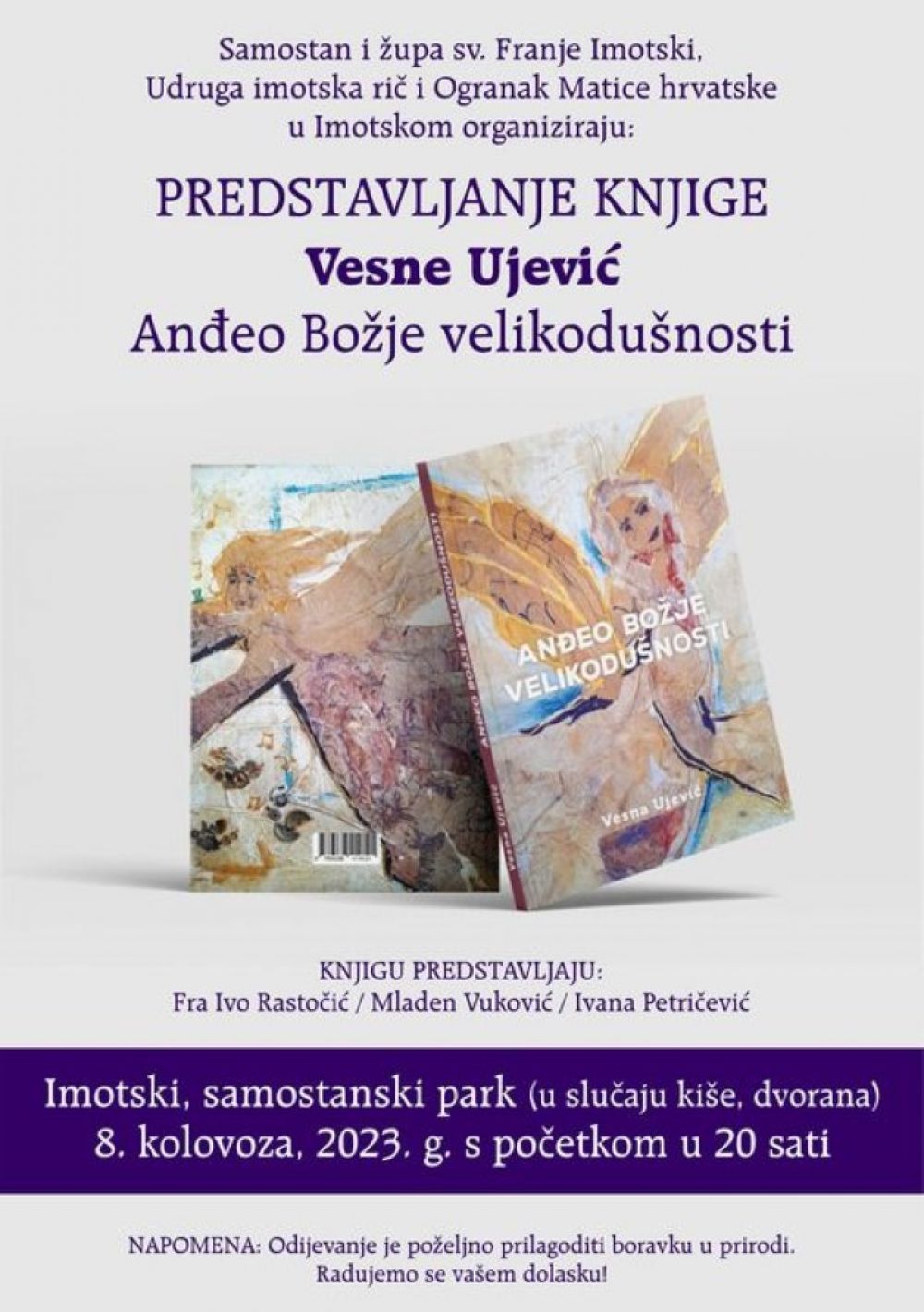 Vrijeme vezano uz Dan pobjede i domovinske zahvalnosti i Dan hrvatskih branitelja uvijek ima neka posebna događanja koja osnažuju taj važni događaj za našu noviju povijest i stvaranje hrvatske države. Duhovnu dimenziju daje im i jedna osoba koju su mnogi prepoznali kao takvu već davno, jer je dobrotvorka i humanitarka. To je Vesna Ujević, spisateljica koja duhovnim pristupom književnosti nama svima svojim pričama, zapravo esejima, kazuje kakvi moramo biti. Ujedno je kvaliteta njezinih radova neupitna, a to će pokazati i nova knjiga koja je upravo tiskana. Naime, u izdanju imotskog ogranka Matice hrvatske, objavljena je knjiga zapisa Anđeo Božje velikodušnosti Vesne Ujević. U toj petoj Vesninoj knjizi je 20 priča, duhovnih zapisa, hodočašća i putopisa (zapadnom Ukrajinom !) ispisanih u proteklih dvadesetak godina.
