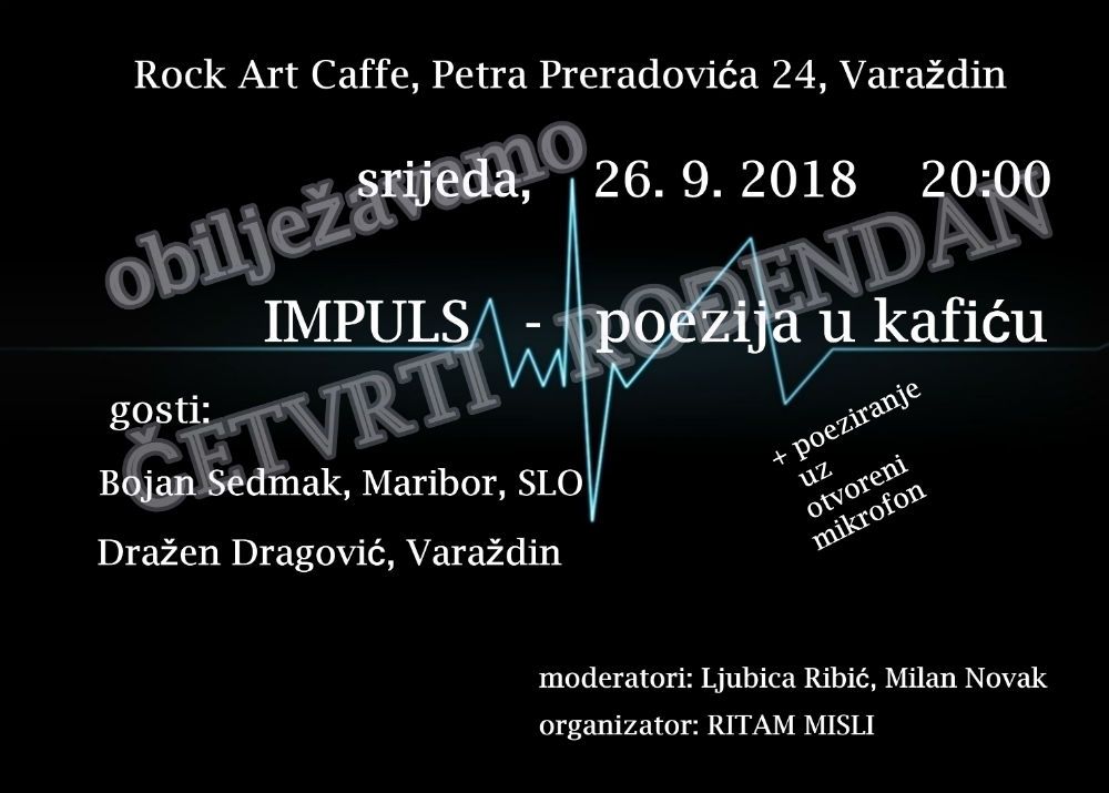 Upornost i ljubav prema poeziji i ljepoti riječi vodila ih je kažu sve ove godine. U srijedu, 26. rujna u Rock Art Caffeu u Varaždinu proslavit će četvrti rođendan Impuls poezije. U proteklih četiri godine ugostili su i predstavili mnoge svjetske i hrvatske autore te otvorili vrata još nepoznatim pjesnicima ističu u pozivnici Ljubica Ribić i Milan Novak. U Impulsu su svoje prve stihove s njima podijelili mnogi sada već prepoznatljivi autor, a sve kroz djelovanje Udruge RITAM MISLI čiji su osnivači Ljubica Ribić i Milan Novak koji neumorno i ustrajno obogaćuju varaždinsku književnu scenu predstavljajući varaždinskoj publici mnoge višestruko nagrađivane autore. Svaki Impuls je jedna krijesnica koja naprosto godi oku promatrača. Ljepoti doživljenog svakako su pridonijeli i mnogi glazbenici koji su večeri obogatili svojim izvedbama.