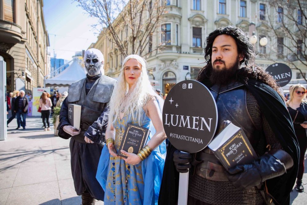 Likovi iz planetarno popularnog serijala Pjesma Leda i Vatre Georgea R. R. Martina bili su danas glavne zvijezde zagrebačke špice. Zapovjednik Noćne straže Jon Snow, majka zmajeva Khaleesi Daenerys i White Walker prošetali su središtem grada, od knjižare Arkadija na Trgu bana Josipa Jelačića sve do Cvjetnog trga, i izazvali oduševljenje mnogobrojnih prolaznika koji su se željeli fotografirati s omiljenim likovima, a svi su imali samo jedno pitanje – kada će se pojaviti hrvatski prijevod Martinova novog romana Vatra i krv čija je radnja smještena 300 godina prije Igre prijestolja. More knjiga na Zrinjevcu potkraj lipnja bit će mjesto prvog predstavljanja tog romana koji je postao planetarni hit i prije nego što je objavljen.