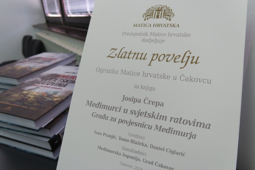 Veliko priznanje stiglo je ovih dana Ogranku Matice hrvatske u Čakovcu. Zlatna povelja Matice hrvatske dodijeljena je za knjigu Josipa Črepa „Međimurci u svjetskim ratovima“ koja je predstavljena u travnju ove godine. S obzirom na to da se, prema riječima predsjednika čakovečkog Ogranka Matice prof. Ivana Pranjića, radi o jednoj od najvažnijih knjiga u posljednjem desetljeću tiskanoj na ovome prostoru, u kojoj je opisano 1500 ljudskih sudbina u najtežim trenucima naše povijesti, Zlatna povelja itekako je zaslužena i opravdana.