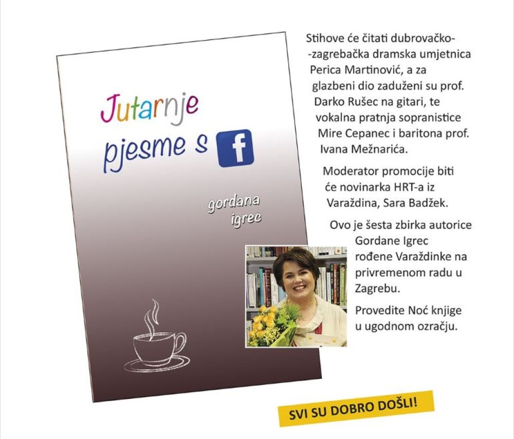 U povodu Noći knjige 23.04. u utorak u gradskoj knjižnici „Metel Ožegović“ u Varaždinu s početkom u 19 sati održat će se promocija zbirke pjesama „Jutarnje pjesme s facebooka“ autorice novinarke i“ pjesnikinje „Gordane Igrec. Stihove će čitati dramska umjetnica dubrovačko-zagrebačka Perica Martinović, a za glazbeni dio zaduženi su prof. Darko Rušec na gitari, te vokalna pratnja altistice Mire Cepanec i baritona prof. Ivana Mežnarića. Moderator promocije biti će novinarka HRT-a iz Varaždina, Sara Badžek.