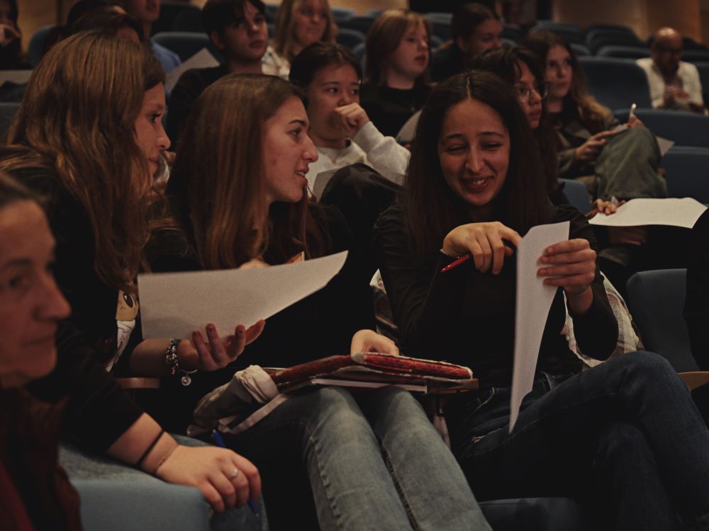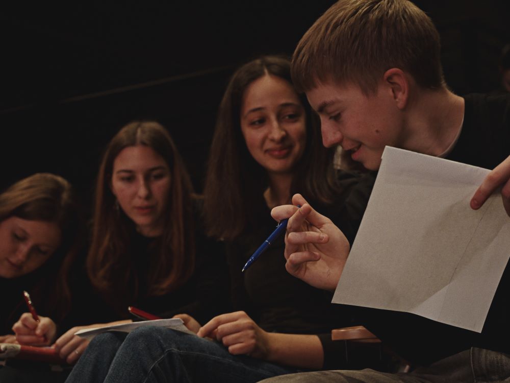 Poetski dan u Kinu Edison zaključen je zabavnom pjesničkom radionicom (na slici dolje) koju je vodila organizatorica priredbe Sandra Jurić. Stihovi učenika i nastavnika kružili su od jedne do druge ruke koja je zapisivala po jedan stih kao nastavak prethodnog, skrivenog presavijanjem papira, da bi se na kraju tako kreirane pjesme čitale naglas i izazvale pljesak i vedre osmjehe.