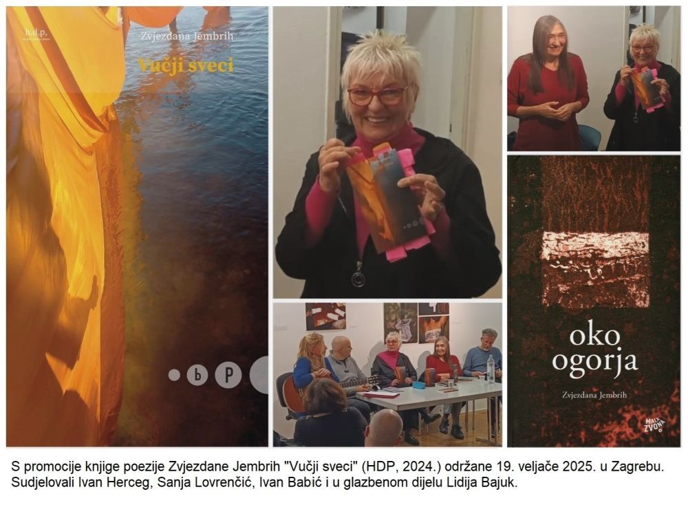 Likovna umjetnica, konzervatorica-restauratorica, spisateljica i istraživačica kulturne baštine Zvjezdana Jembrih posvećena je istraživanju suodnosa materijalnog i duhovnog, umjetničkog i dokumentarnog, prošlosti i sadašnjosti. U srijedu, 19. veljače 2025. u čitaonici i galeriji Vladimir Nazor u Zagrebu održana je promocija njezine nove knjige poezije „Vučji sveci“ u izdanju Hrvatskog društva pisaca. O knjizi su govorili urednik knjige Ivan Herceg i pjesnikinja Sanja Lovrenčić, urednica prethodne knjige Zvjezdane Jembrih „Oko Ogorja“ iz 2023. u nakladi Malih zvona na koju se „Vučji sveci“ formalno-stilski djelomice nastavljaju što se moglo i čuti iz čitanja pjesnika Ivana Babića, Ivana Hercega i same autorice. Jembrih se bavi refleksijama o postojanju i vremenu o čemu piše smjelo, britko i minimalistički. U pjesmama su naglašene vizualnost i intertekstualna slojevitost. Pjesme su u tamnom tonalitetu, katkad i turobne što sugeriraju i naslovi nekih ciklusa, npr. Pjesme o dobroj smrti/Ars moriendi, Dies irae, Tjeskobne/Zima/Vučji sveci, Pred/ratne, no ima i svjetline kako su urednici, koji su i sami pjesnici, istaknuli, a „novost“ je i uvođenje glazbenih motiva u pjesme, npr. ciklusi Klavirske sonate i Adaggio/Zmija na zaslonu. U glazbenom dijelu promocije nastupala je Lidija Bajuk koju s autoricom veže zajednički interes za tradicijsku baštinu Međimurja, odnosno sudjelovanje u etnografskim istraživanjima. Na njezin su poziv i uputu zapjevali svi prisutni što je bio dojmljiv svršetak službenog dijela promocije, a uvod u neslužbeni – druženje s autoricom i pjesnicima.