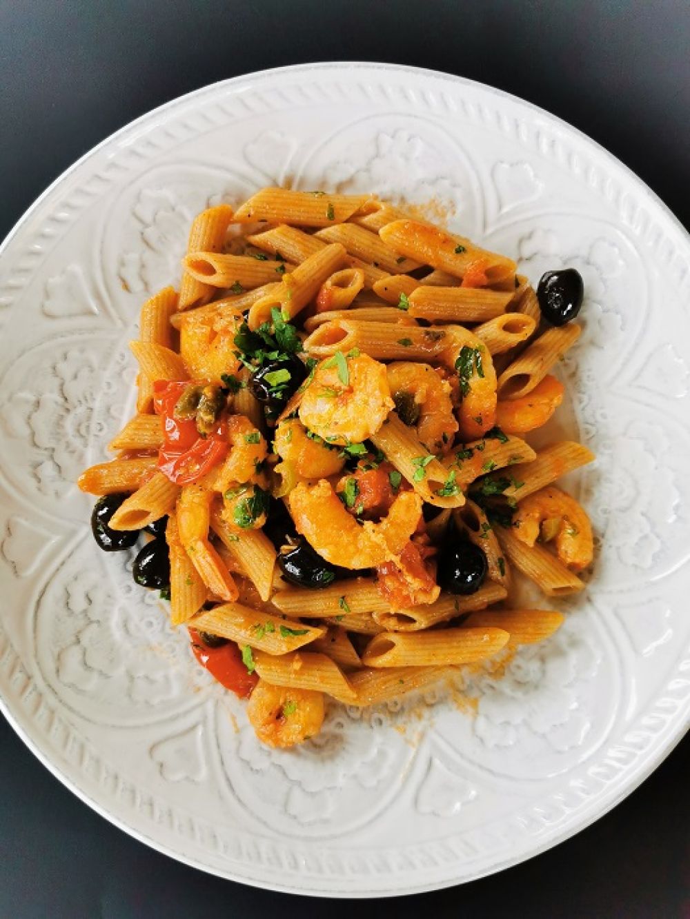 Na ugrijano maslinovo ulje baciti usitnjeni češnjak i jedan dio nasjeckanog peršina, promiješati nekoliko puta da pusti miris i dodati rajčicu, podliti vinom i temeljcem (temeljac od procijeđenih, prokuhanih oklopa kozica s povrćem). Prokuhati 10 minuta i ubaciti kozice i inćune ili srdele, kapare, začiniti solju i paprom. Tjesteninu prokuhati i pomiješati sa umakom pa ostaviti koju minutu da upije sok. Na kraju dodati crne masline i nasjeckani peršin.