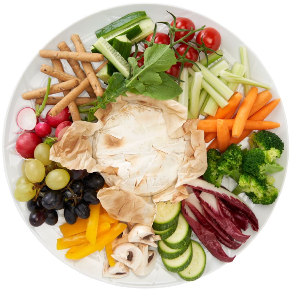 Brokulu kratko blanširajte, šampinjone očistite i narežite na četvrtine. Mrkvu i stabljičasti celer ogulite i narežite na štapiće. Papriku očistite i narežite na štapiće, kao i krastavac. Tikvicu narežite na ploške, rotkvice prepolovite, a grožđe operite. Trevisano radič natrgajte na listiće i operite.