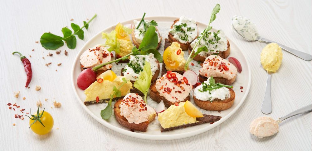 Po želji začinjene sireve mažite bogato na kruščiće i ukrasite svježim biljem, čilijem, cherry rajčicama i sl.