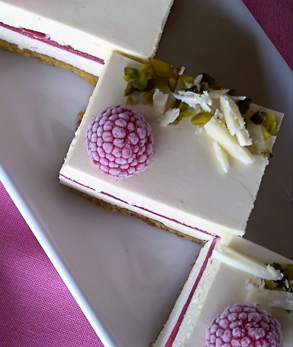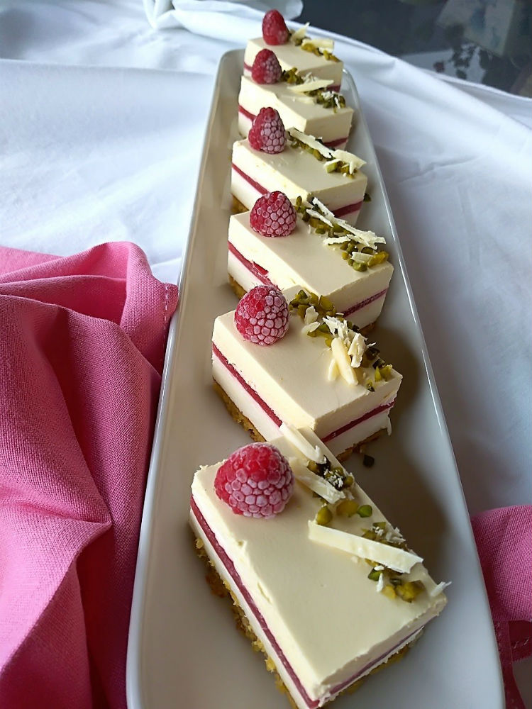 Za mousse od bijele čokolade i pistacija navlažiti želatinu hladnom vodom kao i u prethodna dva slučaja. Ugrijati mlijeko do vrenja pa ga oprezno umiješati u jaja pomiješana sa šećerom i pastom od pistacija. Kuhati kratko do 80 stupnjeva. Maknuti sa vatre pa dodati čokoladu izlomljenu na kockice i zatim ocijeđenu želatinu. Ohladiti, pomiješati sa meko tučenim slatkim vrhnjem i preliti preko želea od malina. Sve zajedno još dobro ohladiti 2-3 sata, a može i preko noći pa ukrasiti sjeckanim pistacijama, bijelom čokoladom, malinama ili po želji.
