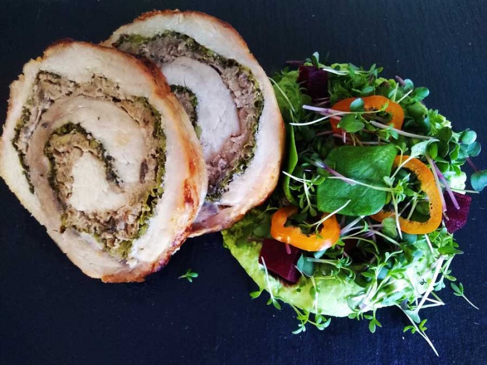 Kare razrezati oprezno u jedan veliki odrezak, prekriti ga prozirnom folijom i istući, posoliti i popapriti. Na meso rasporediti kelj i ostaviti otprilike 2 cm nepokrivenog ruba. Na meso ravnomjerno rasporediti nadjev, zaviti roladu i povezati je kuhinjskom špagom. Lim za pečenje lagano premazati maslinovim uljem, položiti roladu i peći na 180 stupnjeva oko sat i pol, ovisno o veličini. Povremeno podliti pilećim temeljcem.