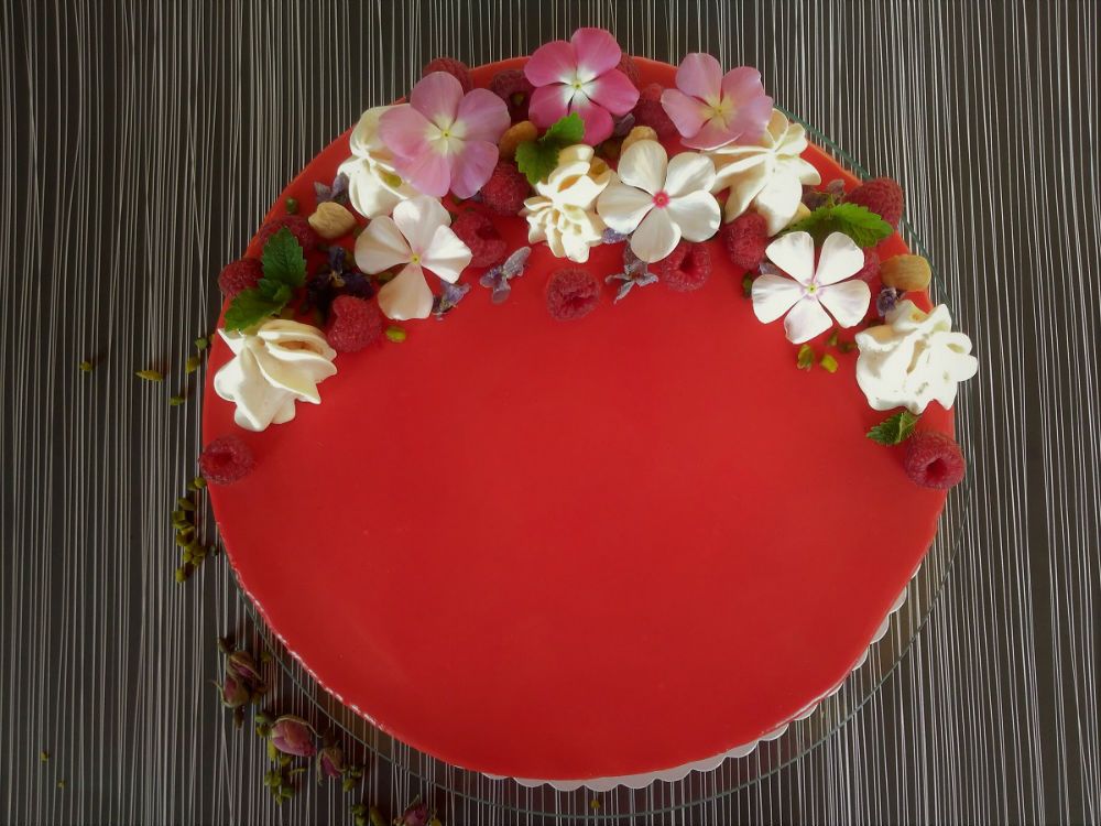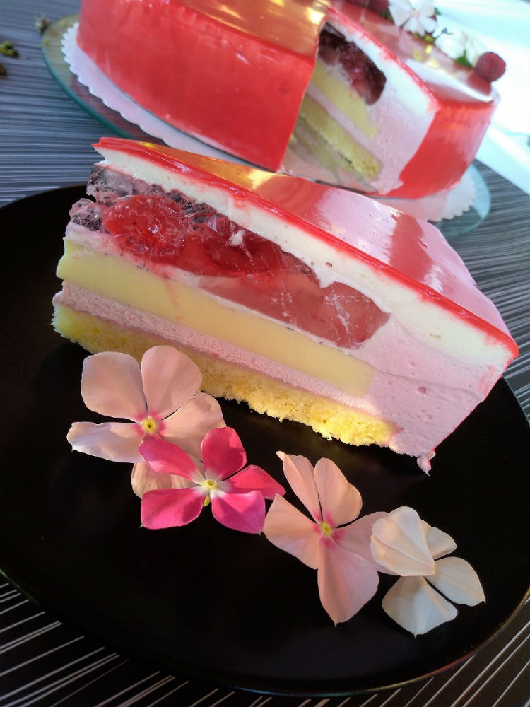 Umetke od pjenušca i vanilije kratko staviti u zamrzivač da malo očvrsnu. Na biskvit kojeg ste prethodno stavili na dno kalupa uliti jedan sloj moussea od malina, staviti na kratko u hladnjak da se malo stegne pa na njega staviti krug od vanilije. Dodati još jedan tanki sloj moussea, pazeći pri tome da se popuni praznina između kreme i stijenke obruča. Opet kratko držati u hladnjaku pa staviti na sredinu žele od pjenušca i sve skupa prekriti ostatkom moussea. Zagladiti površinu, staviti u hladnjak i hladiti minimalno 4 sata. Ohlađenu tortu izvaditi iz kalupa i preliti glazurom. Glazura opet zahtijeva hlađenje, a nakon toga ukrasiti po želji, ovisno što vam je na raspolaganju: kolačići od meringe, jestivo cvijeće, voće, listići mente……