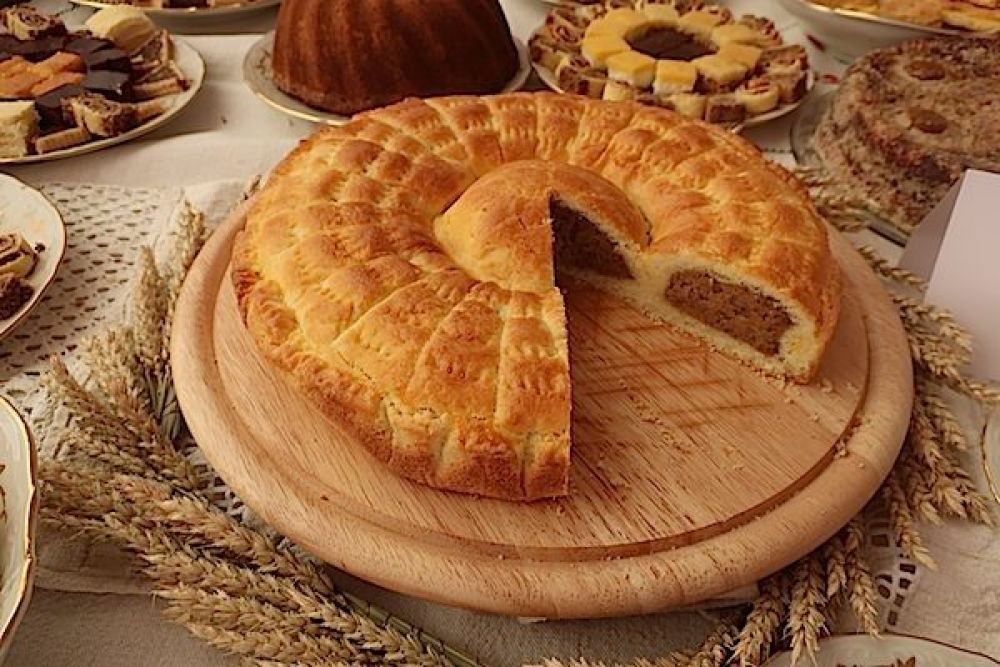 Umijesite tijesto i lijepo ga izraditi te podijeliti u 2 dijela. Razvaljajte tijesto u krug promjera 30 cm. Zatim pripremite nadjev tako da orahe pomiješate sa šećerom i prelijete kipućim mlijekom. Zatim dodajte i kuhanu ječmenu kašu te lagano izmiješajte. U sredinu kruga tijesta staviti 3 žlice nadjeva, a od ostatka napraviti vijenac. Oko sredine stavite drugi krug tijesta i utisnite krajeve. Premažite umućenim jajetom. Pecite u pećnici zagrijanoj 180 °C oko 30 min.
