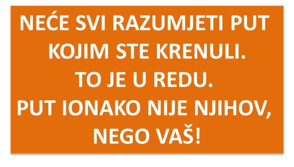 Dakle, neće svi razumjeti put kojim ste krenuli. To je sasvim u redu. To ionako nije njihov nego samo Vaš put, koliko god utjecao i na druge. A vi ste, pošavši njime, prihvatili sve njegove posljedice, njegove zamke, ljepotu i uspjeh. Sretan Vam put!