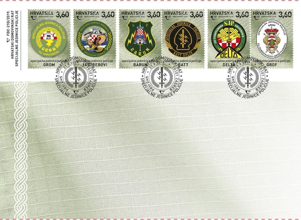 Hrvatska pošta pustit će u optjecaj 27. rujna prigodne poštanske marke „Hrvatski domovinski rat – Specijalne jedinice policije“. Izdanje se sastoji od 21 poštanske marke koje imaju za motiv ambleme specijalnih jedinica policije, a autor izdanja je Dean Roksandić, dizajner iz Zagreba. Vrijednost svake izdane marke je 3,60 kuna, a prigodno izdanje tiskano je u nakladi od 25 000 araka. Marke su izdane u zajedničkom arku od 21 marke i četiri privjeska, a Hrvatska pošta izdala je i četiri prigodne omotnice prvog dana (FDC).