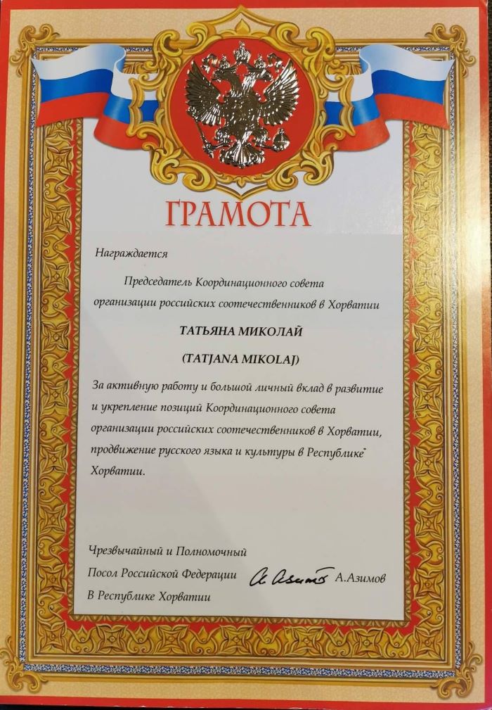 Na svečanoj ceremoniji odlaska ruskog veleposlanika Azimova odlikovana predsjednica Udruge “Kalinka” Tatjane Mikolaj