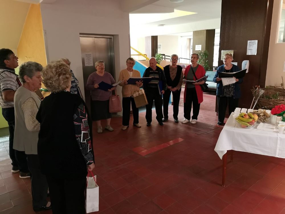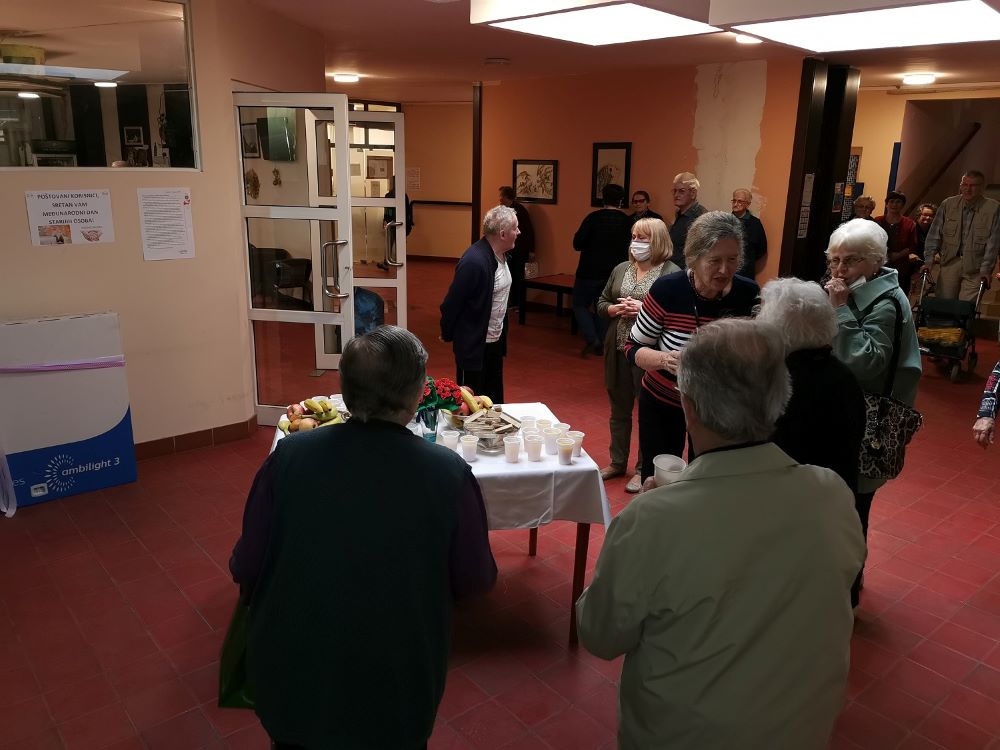 Radnici Doma za starije i nemoćne u foajeu Doma prilikom dolaska i odlaska s ručka korisnicima su čestitali Međunarodni dan starijih osoba izbjegavajući veća grupiranja. Zborovođa i članice zbora spontano su zapjevali te izveli nekoliko pjesama u čemu su se pridružili ostali korisnici.