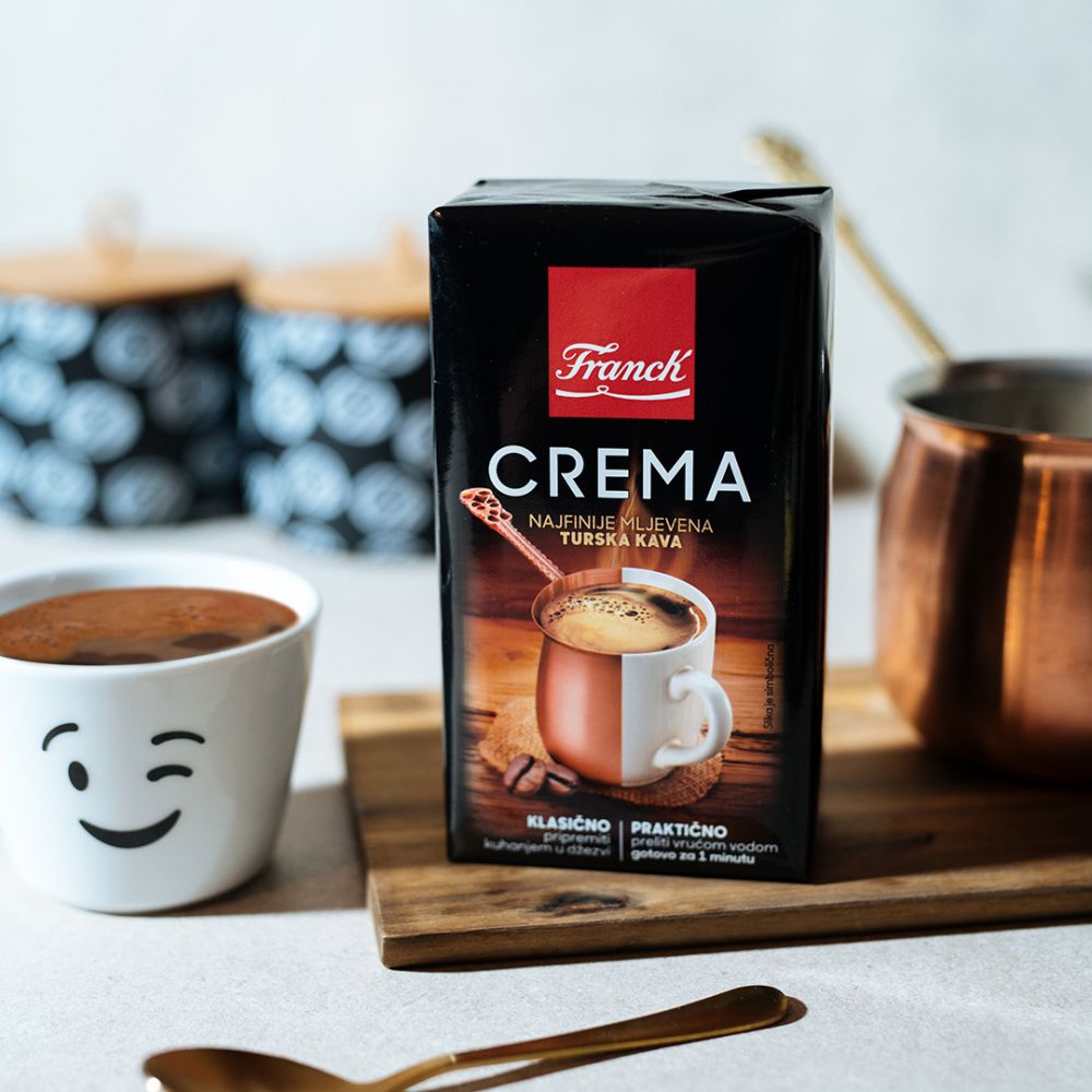 Franck Crema idealno je rješenje za sve kavoljupce, za svaku prigodu i gdje god se nalazili. Ove fine arome, uz bogatu pjenu, pružaju jedinstven dugotrajni okus koji će zadovoljiti nepce istinskih ljubitelja turske kave bilo da su u društvu, sami, na poslu ili putovanju s obitelji i prijateljima.