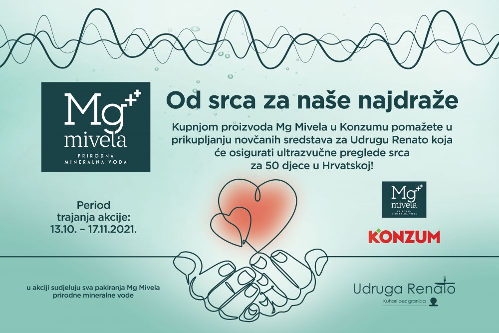 Mg Mivela, gazirana prirodna minerala voda pokrenula je humanitarnu akciju kojoj je cilj prikupljanje novčanih sredstava za osiguranje ultrazvučnog pregleda srca za djecu diljem Hrvatske. Od svakog kupljenog pakiranja Mg Mivela odvojit će se dio sredstava i u suradnji s udrugom „Renato – kuhari bez granica“ djeci slabijeg imovinskog stanja osigurati 50 preventivnih besplatnih ultrazvučnih pregleda u bolnicama privatnim poliklinikama diljem Hrvatske. Akcija traje od do 17. studenoga u svim Konzumovim poslovnicama.