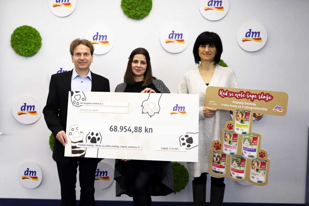 dm je udruzi Prijatelji životinja predao donaciju od 23.124 konzerve hrane namijenjene životinjama o kojima brinu Udruga Farmica iz Našica, Udruga Pobjede (Azil Osijek) i Mandičina udruga iz Osijeka, Sklonište Dumovec iz Zagreba, Udruga Lajka iz Novigrada Podravskog, udruga Šapama od srca iz Makarske, udruga SOS Šape iz Poreča, Udruga Berta (Sklonište Kninske njuškice) i Udruga Šibenske šape.