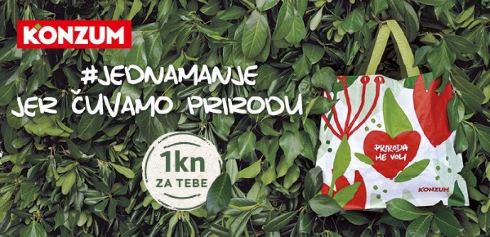 Konzumova kampanja „Jedna manje“, pokrenuta prošle godine s ciljem poticanja građana na što češće korištenje višekratnih ekoloških torbi i smanjenja plastičnog otpada u Hrvatskoj, nastavlja se i u 2022. godini. Tako će kupci koji koriste višekratnu ekološku torbu „Priroda me voli“ svaki put dobiti jednu kunu popusta u Konzumu na ukupan iznos računa do kraja godine.