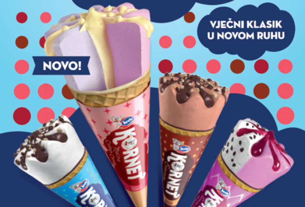 Osim novog okusa malina - cotton candy, cijeli asortiman korneta od sada je dostupan u novom ruhu koji je u potpunosti osvježio izgled kornet sladoleda.