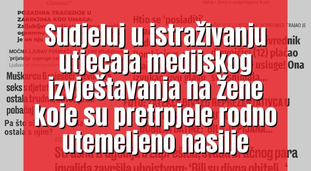 Pozivamo punoljetne žene koje su pretrpjele rodno utemeljeno nasilje na sudjelovanje u istraživanju. Ispunjavanje ovog upitnika traje 15-ak minuta. Razumijemo da sudjelovanje u istraživanju zahtijeva i vrijeme i trud pa unaprijed zahvaljujemo svim ženama koje će se odazvati i pomoći nam u istraživanju. Odgovori i iskustva žena koje su pretrpjele rodno utemeljeno nasilje su izuzetno važni za promjene u medijskom izvještavanju koje želimo potaknuti.