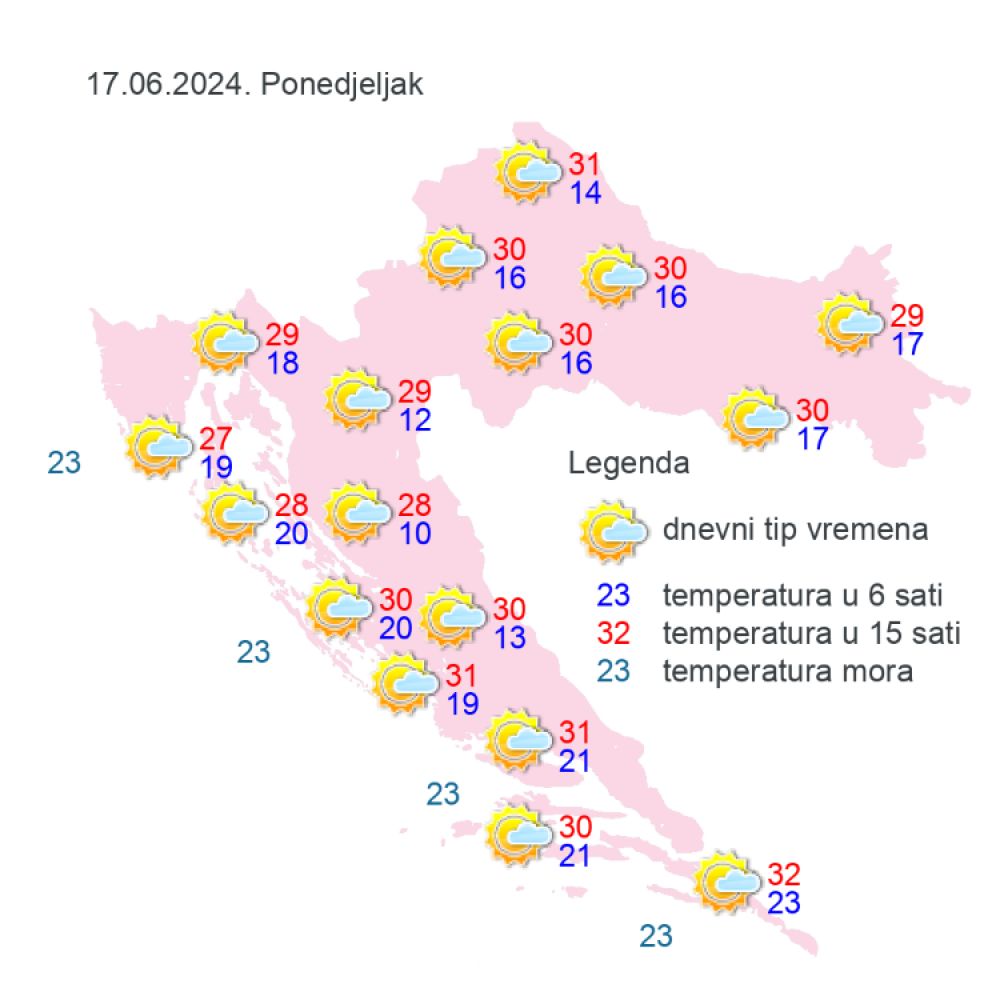 Prognoze za Hrvatsku najavljuju početak vrućeg ljeta. Jača anticiklona nad našim područjem, što donosi stabilne vremenske prilike koje će ovoga puta trajati dulje. Trenutno su vremenski poremećaji daleko od naših krajeva, pa HZMZ za danas najavljuje - Pretežno sunčano, vrlo toplo i vruće. Poslijepodne su uz jači razvoj oblaka lokalno mogući kratkotrajni pljuskovi, uglavnom na istoku. Ujutro na kopnu ponegdje magla. Vjetar većinom slab, na Jadranu popodne i umjeren jugozapadni i sjeverozapadni. Najviša dnevna temperatura zraka uglavnom između 27 i 31 °C.