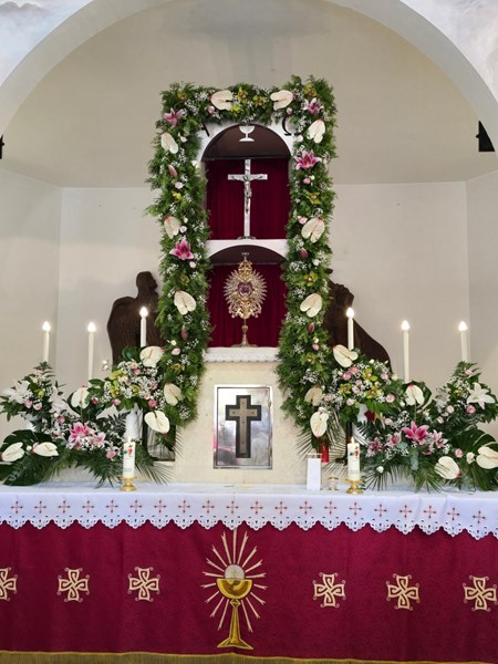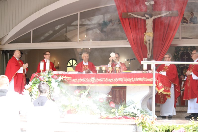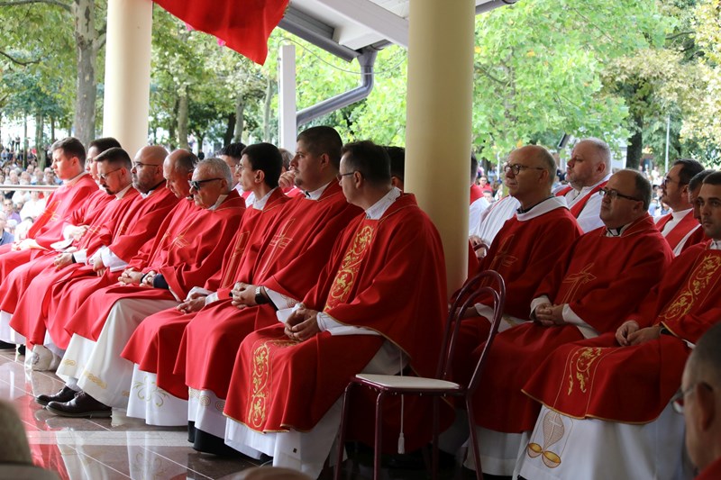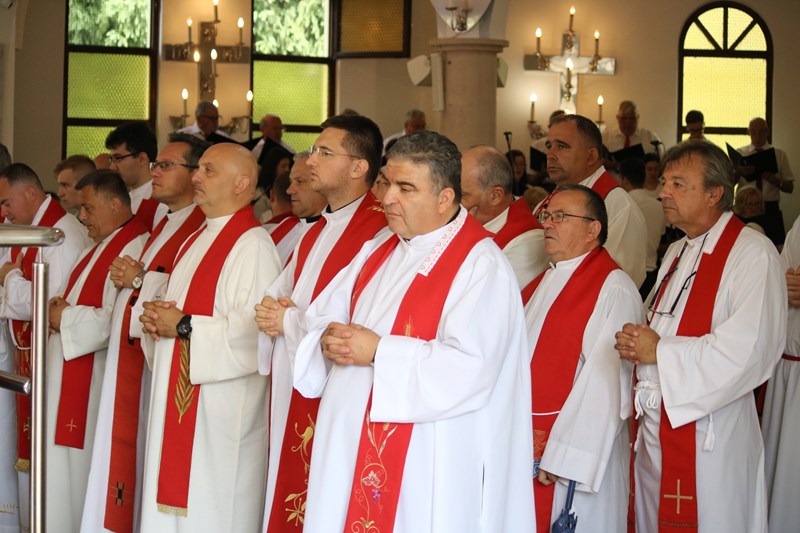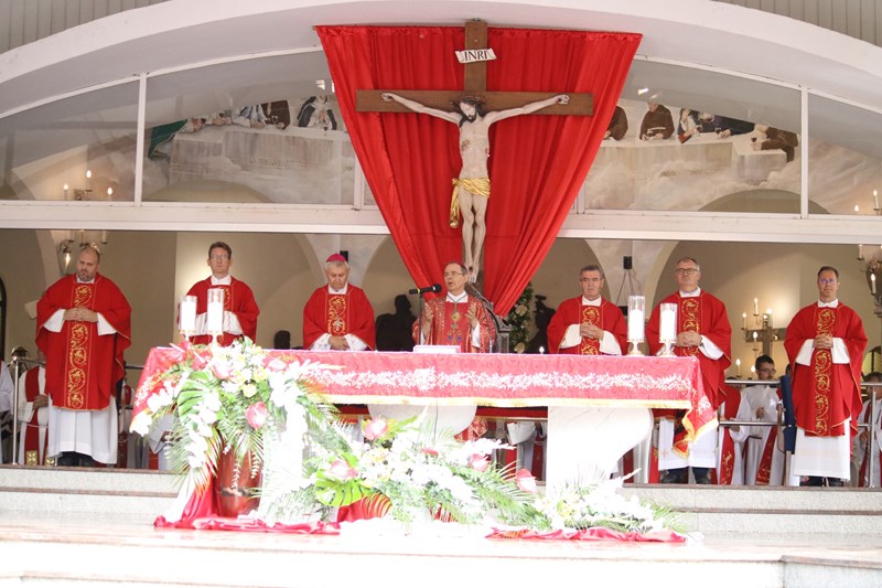 U uvodu u euharistijsko slavlje mons. Radoš zahvalio je Bogu na kiši koja je, kako je rekao, očistila zrak i podsjetila da se za svako slavlje želimo pripremiti čisti i dostojno obučeni. Naglasio je, međutim, da voda može oprati samo vanjštinu, dok jedino Kristova krv ima snagu oprati život iznutra i osloboditi čovjeka od grijeha. „Ona se prolijeva poput potoka da nas opere,“ istaknuo je biskup te pozvao vjernike da u ovom svetištu Presvete Krvi Kristove zamole Gospodina da ih očisti od svake slabosti i grijeha kako bi dostojno slavili svetu misu.