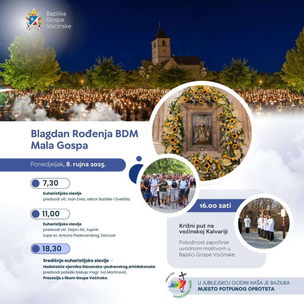 Blagdan Rođenja Blažene Djevice Marije (Mala Gospa), slavi se 8. rujna — taj dan je i službeni Dan Varaždinske županije. Središnje euharistijsko slavlje tog dana održava se u varaždinskoj katedrali, u 18 sati i bit će predvođeno varaždinskim biskupom. Na misi sudjeluju i županijski dužnosnici: župan, zamjenica župana, predsjednik Županijske skupštine, članovi Poglavarstva županije. Na blagdan Rođenja Blažene Djevice Marija – Mala Gospa, u ponedjeljak, 8. rujna, vjernici iz župa Slavonsko-podravskog arhiđakonata hodočaste u voćinsko Svetište. Središnje euharistijsko slavlje u 18.30 sati predvodi požeški biskup msgr. Ivo Martinović, a pri svršetku slavlja uslijedit će procesija s likom Gospe Voćinske.