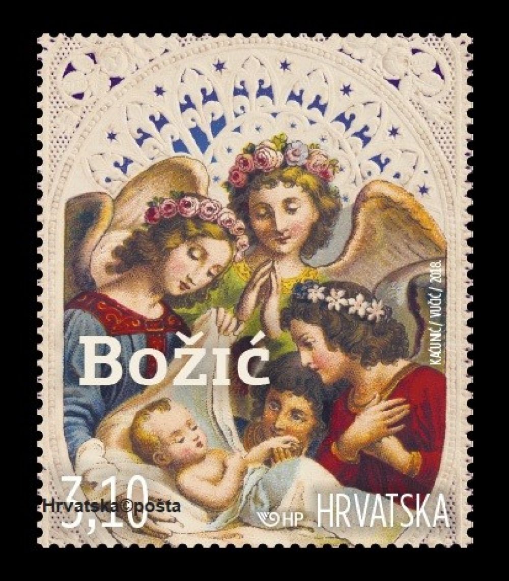 Hrvatska pošta osvjetljavala je blagdan Božića u različitim oblicima njegove prisutnosti i slavljenja. Ove godine motiv hrvatske božićne marke posvećen je nježnomu žanru svetih sličica. Dr. sc. Željka Čorak, znanstvena savjetnica – emerita u Institutu za povijest umjetnosti, napisala je: „Sličica kojom Hrvatska pošta časti ovaj blagdan Božića pripada devetnaestostoljetnom sjećanju na spomenutu tehniku caniveta. Taj se tiskarski postupak pojavljuje oko 1840. godine, i ova sličica nije nastala mnogo nakon toga. Njezin je ugođaj romantični ugođaj sredine pretprošlog stoljeća, a pokazuje i dublje slojeve pamćenja. Stilizacija fizionomija sa sitnim ustašcima, napoleonska kosica malog Isusa, sjećaju se sve do osamnaestog vijeka. Bidermajerske uspomene predstavljaju ružini vjenčići, također sabranost, tišina i mir anđeoskih likova. Romantični su anđeoski uvojci i boje odjeće. I rani se historicizam osjeća u ornamentalnoj čipkastoj podlozi prizora.“