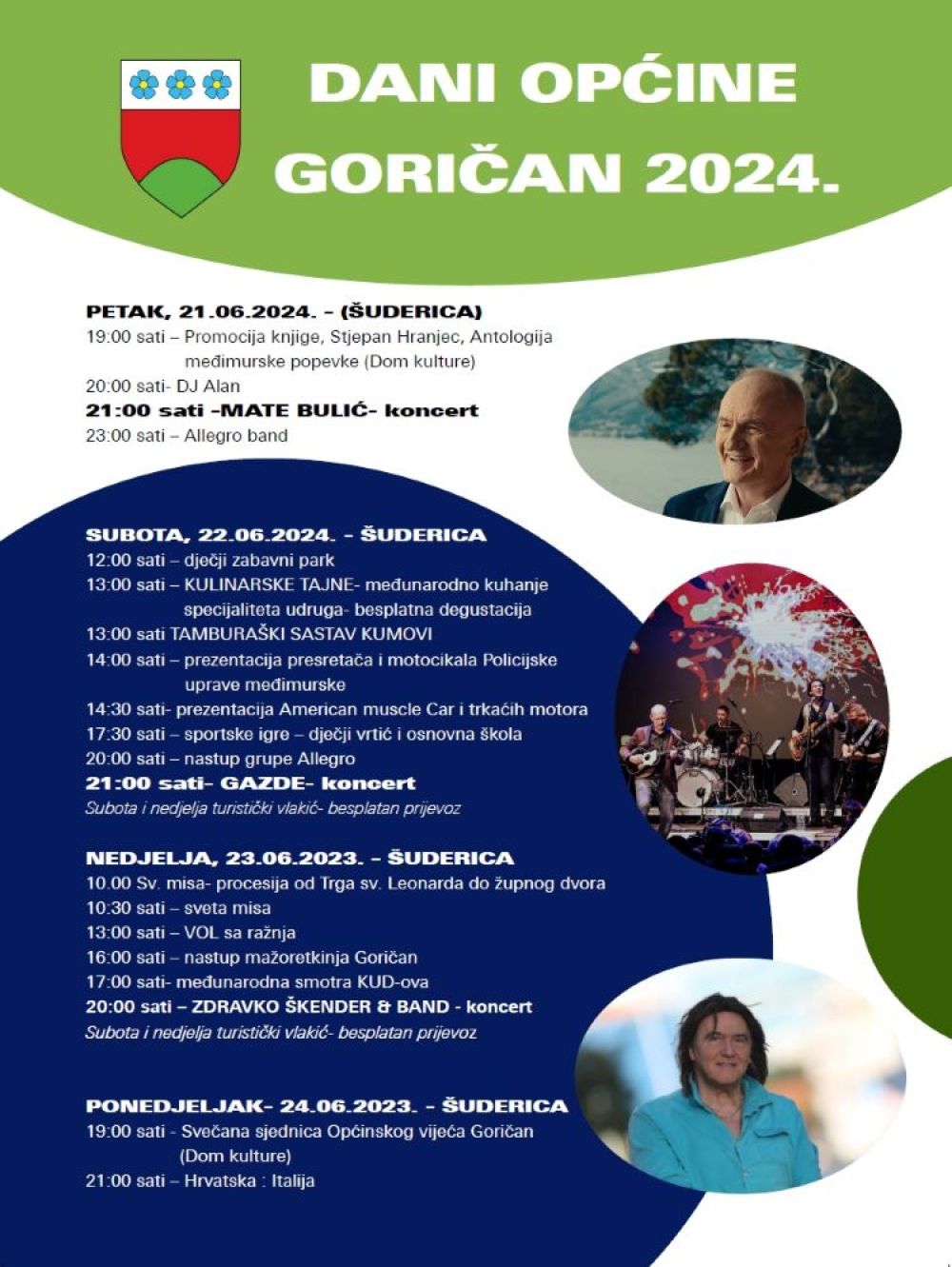 Općina Goričan je za svoj 31. rođendan od 21. do 24. lipnja, pripremila bogat program s mnoštvom zanimljivih događanja, koncerata, obiteljskog druženja, sportskih igara te brojnih drugih aktivnosti za posjetitelje. Većina događaja održat će se u najljepšem općinskom parku, na Šuderici u Goričanu. Na Šuderici je Općina organizirala i koncerte poznatih glazbenika. U petak, 21. lipnja, od 21 sat nastupa Mate Bulić. Dan kasnije u subotu na istoj će se lokaciji održavati događanja za sve generacije. U večernjim satima na pozornicu će najprije stati grupa Allegro, a nakon njih od 21 sat svima dobro poznate Gazde.