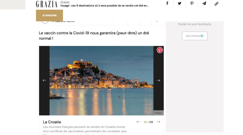 Femme Actuelle, jedan od najčitanijih francuskih ženskih lifestyle magazina, u članku „Été 2021 : quelles sont les destinations de vacances les plus prisées cette année?“ izdvaja Hrvatsku kao jednu od najpopularnijih destinacija za ljetni odmor Francuza u kojoj se već sada može sjediti na terasama kafića i restorana. U članku su, uz Hrvatsku, izdvojene i pojedine francuske destinacije te druge europske zemlje u koje se može putovati ovog ljeta.
