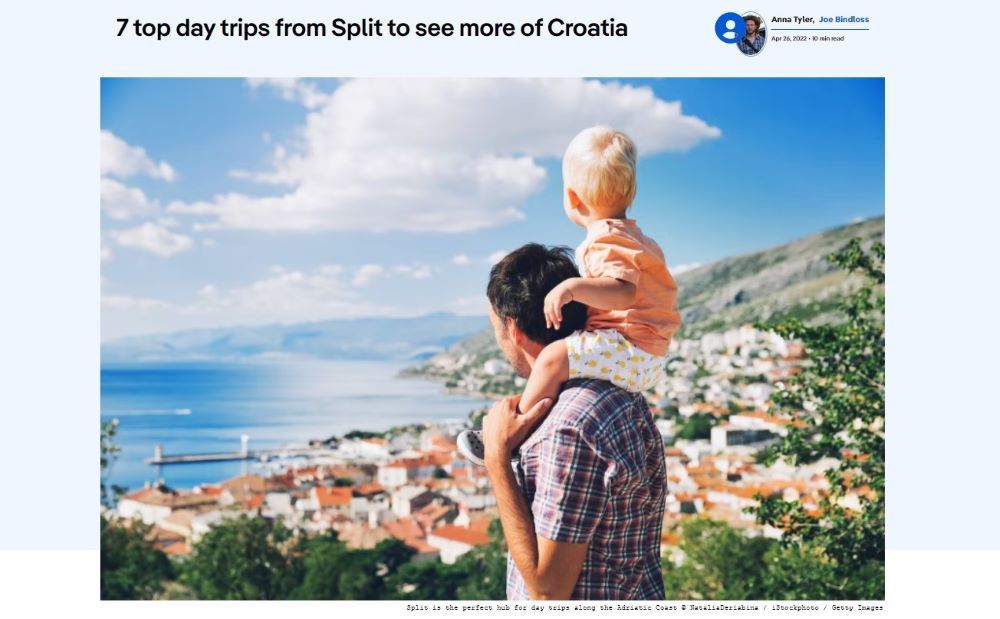 Riječ je o članku „7 top day trips from Split to see more of Croatia“, novinara Anne Tyler i Joe Bindlossa, koji Split opisuju kao destinaciju koja privlači velik broj putnika zbog brojnih povijesno-kulturnih atrakcija, obližnjih otoka i prekrasnog zaleđa. Također, ističu kako je Split savršena stanica za sve one koji vole gradski odmor uz mogućnost odlaska na jednodnevne izlete.