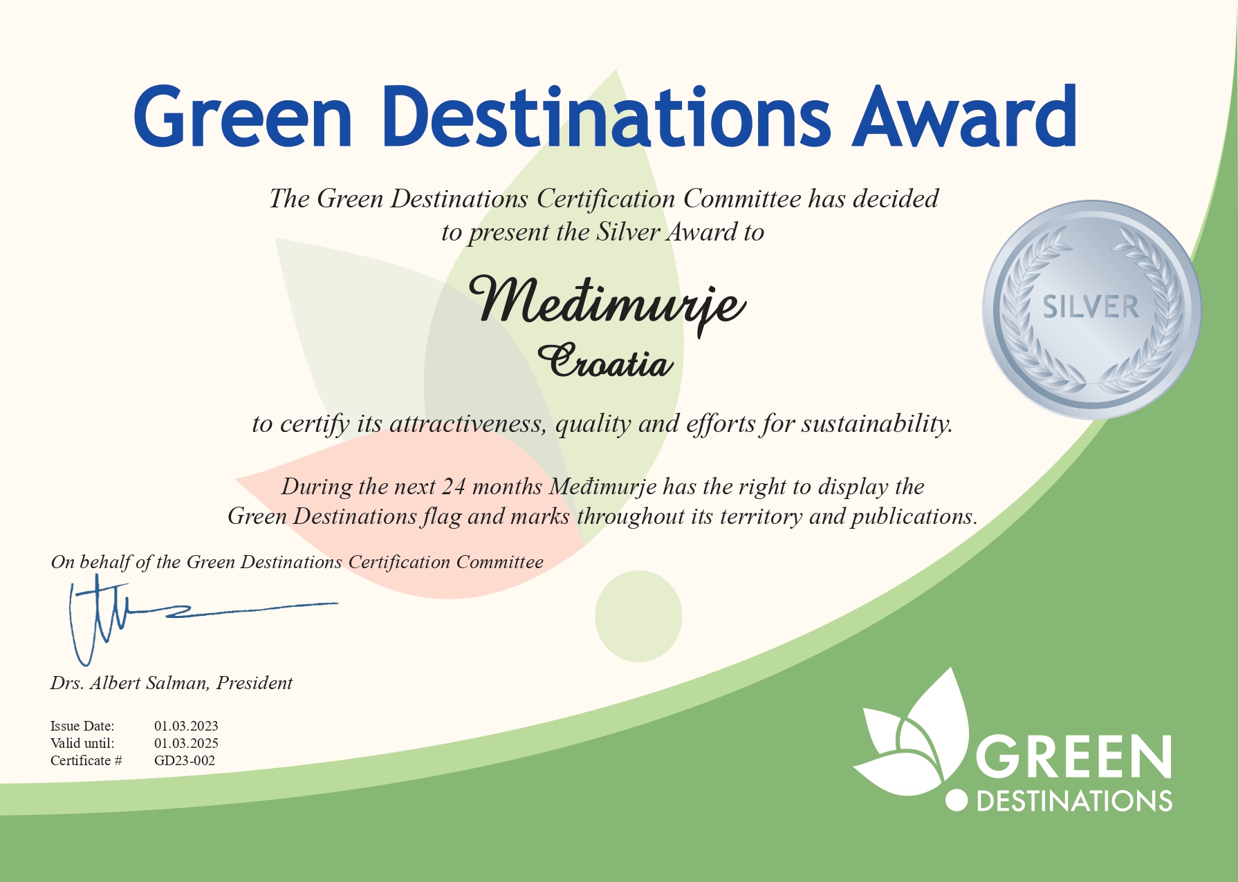 Nastojanja i dugogodišnji predan rad Međimurske županije i njezine Turističke zajednice na stvaranju sadržaja održivog turizma prepoznate su na svjetskoj razini te je na najvećem svjetskom turističkom sajmu u Berlinu, Međimurje proglašeno Green Destinations regijom, te joj je dodijeljena srebrna oznaka Green Destination. Time je Međimurje postala prva regija u Hrvatskoj i četvrta na svijetu koja je pristupila ovom certificiranju!
