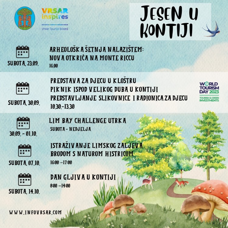 Uz zanimljivosti o novim otkrićima na arheološkom nalazištu Monte Ricco, u rujnu će se obilježiti i Svjetski dan turizma uz predstavu za djecu Udruge Birikina, zajednički piknik na otvorenom i predstavljanje slikovnice „Puž koji je promijenio svoju kućicu“ autorice Petre Matulić Žeravica. Listopad donosi sportsku utrku Lim Bay Challenge, istraživanje Limskog zaljeva brodom uz Naturu Histricu i naposljetku proslavu Dana gljiva.