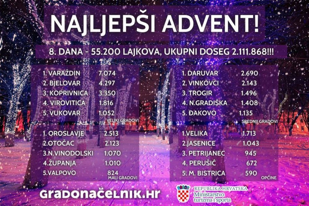 Nakon osam dana glasanja i preko 55 tisuća lajkova samo na našoj FB stranici, imamo pobjednike ovogodišnjeg, 3. izbora za Najljepši advent u Hrvatskoj kojega smo proveli uz pokroviteljstvo Ministarstva turizma i sporta! U izboru su sudjelovala čak 64 adventa iz 48 gradova i 16 općina, a njihove slike koje su fanovi podijelili 4.565 puta vidjelo je u ovih osam dana 2.111.868 korisnika FB-a!