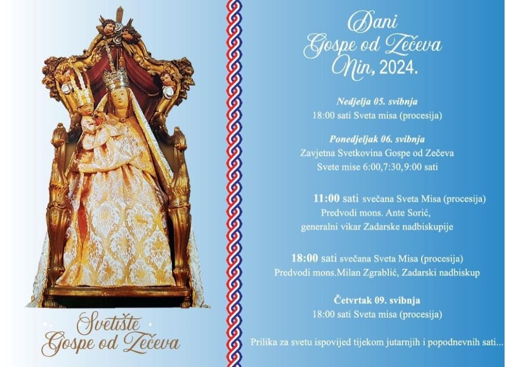 Nin - na Spomendan Prikazanja Gospe na otoku Zečevo kreću put tog posvećenoga mjesta brojni hodočasnici.Svake se godine početkom svibnja u Ninu okuplja veliki broj hodočasnika obilježavajući tako godišnjicu ukazanja Gospe. Ona se, prema pisanim tragovima i službenom priznanju ondašnje Ninske biskupije, 5. svibnja 1516. godine na otočiću Zečevu ukazala pastirici, udovici Jeleni Grubišić. Nin je tako postao značajno marijansko svetište u kojem se svake godine u svibnju okuplja velik broj vjernika. Blagdan Gospe od Zečeva se slavi prvog ponedjeljka prije Blagdana Uzašašća. Poslije misnog slavlja započinje svečani ophod vjernika ulicama grada Nina koje su blagdanski uređene. Vjernici pritom nose kip čudotvorne Gospe od Zečeva te pjevaju himnu Dobra Majko sa Zečeva te druge pjesme posvećene Djevici Mariji. Čudotvorno Ukazanje Gospe od Zečeva obilježava se tri put tijekom godine: 5.svibnja, na utemeljeni blagdan i 5. kolovoza.