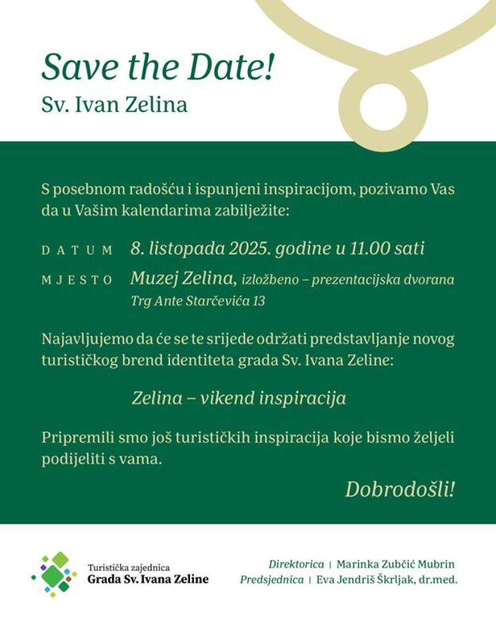 Turistička zajednica Grada Sv. Ivana Zeline poziva članove naše Udruge da se odazovu svečanom predstavljanju potpuno novog turističkog brend identiteta grada u srijedu, 8. listopada 2025. godine. Toga dana, s početkom u 11.00 sati, u reprezentativnim prostorima izložbeno-prezentacijske dvorane Muzeja Zelina, na adresi Trg Ante Starčevića 13, održat će se svečano predstavljanje potpuno novog turističkog brend identiteta grada. Ovaj strateški iskorak okrunjen je sloganom "Zelina – vikend inspiracija", koji jasno komunicira viziju pozicioniranja ovog prigorskog bisera kao idealne destinacije za kratke, ali sadržajno bogate odmore.