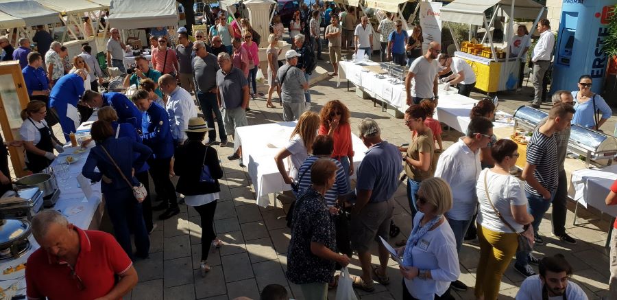 Legendarni makarski restoran Peškera koji posluje od 1960. godine, strogo se držao klasike, pa su na izložbu donijeli platu s pršutom iz Imotske krajine, paškim i sirevima OPG-ova Zabiokovlja. Na stolu im se našla pašticada, pečenja janjetina s mladim krumpirom, štrudel, ono što strani gosti najviše im traže u potrazi za domaćim okusima. Kap uja, lani otvoreni restoran na Kačićevom trgu, poslužili su proljetne rolice sa zapečenim kozjim sirom, goveđe obraze spremljene na pašticadu s domaćim njokima i tiramisu. Riječ je o lokalu gdje se za marendu odlazi na zabiokovska mesna jela poput telećih koljenica i goveđih jezika, kao i na morske specijalitete od dnevnih ulova.