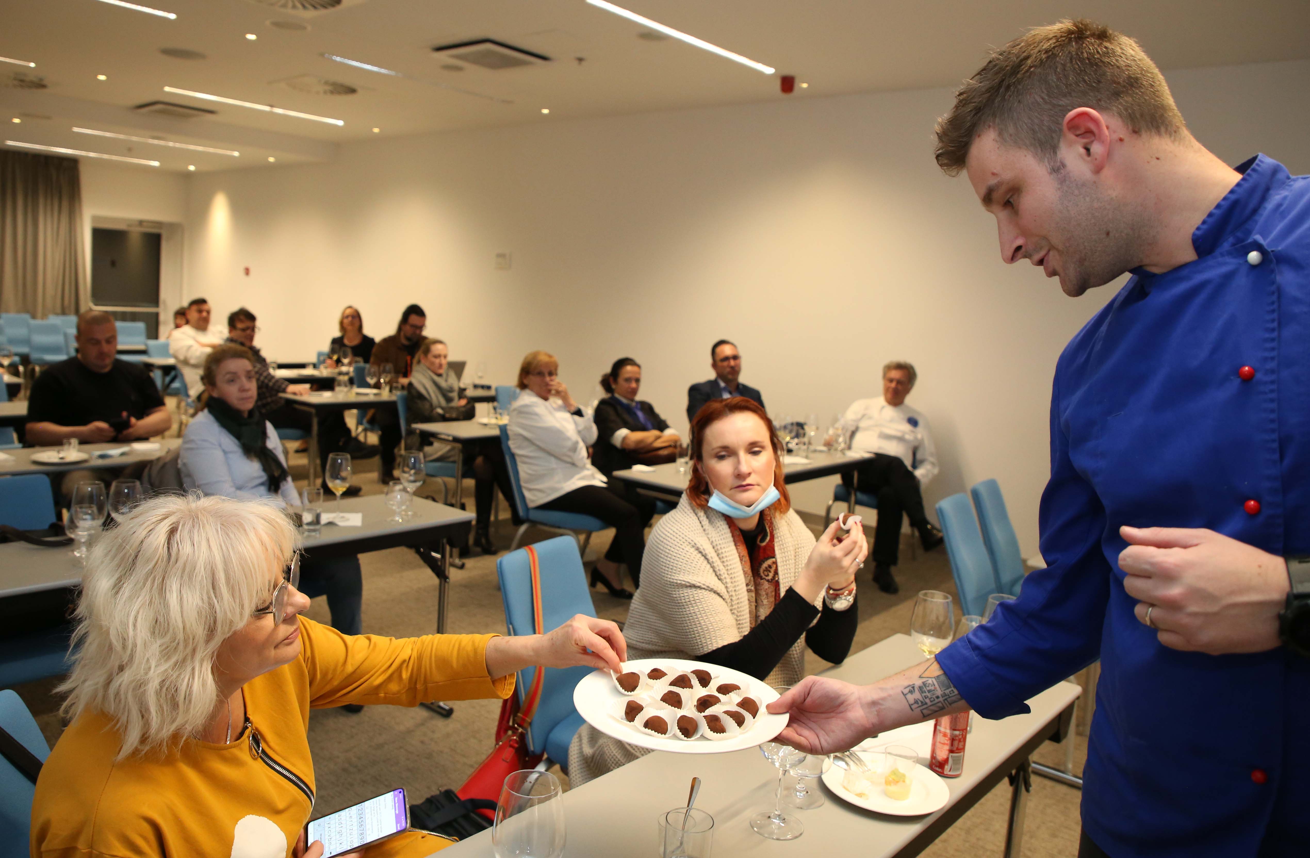 Jutarnje edukacije započeo je, pak, chef Željko Neven Bremec master classom o pripremi bijeli ribe u sklopu programa Mediterranean Culinary Arts, kojeg inače u cjelovitoj verziji vode Željko Neven Bremec, Stevo Karapandža i Hrvoje Zirojević. Splitskim je ugostiteljima, kuharima i profesionalcima iz F&B sektora, Bremec pokazao je suvremene tehnike filetiranja lubina na francuski i skandinavski način, a potom je istanjene riblje odreske poslužio u carpacciu s mandarinom i limunom. Pravio je i gregadu od romba i kokota, pržene fileta mola (oslića) s krumpir salatom, pa poslužio uz wasabi majonezu i kreme od jeruzalemske čičoke i mrkve. Pripremljena je i focaccia, vrsta talijanske tanke pogače. Stevo Karapandža, koji se pridružio Bremecu, poručio ugostiteljima na edukaciji da što više koriste brački varenik, drevni i autohtoni začin od vinskog mošta, kojeg u svojoj inačici danas više proizvode Makedonci od Hrvata.