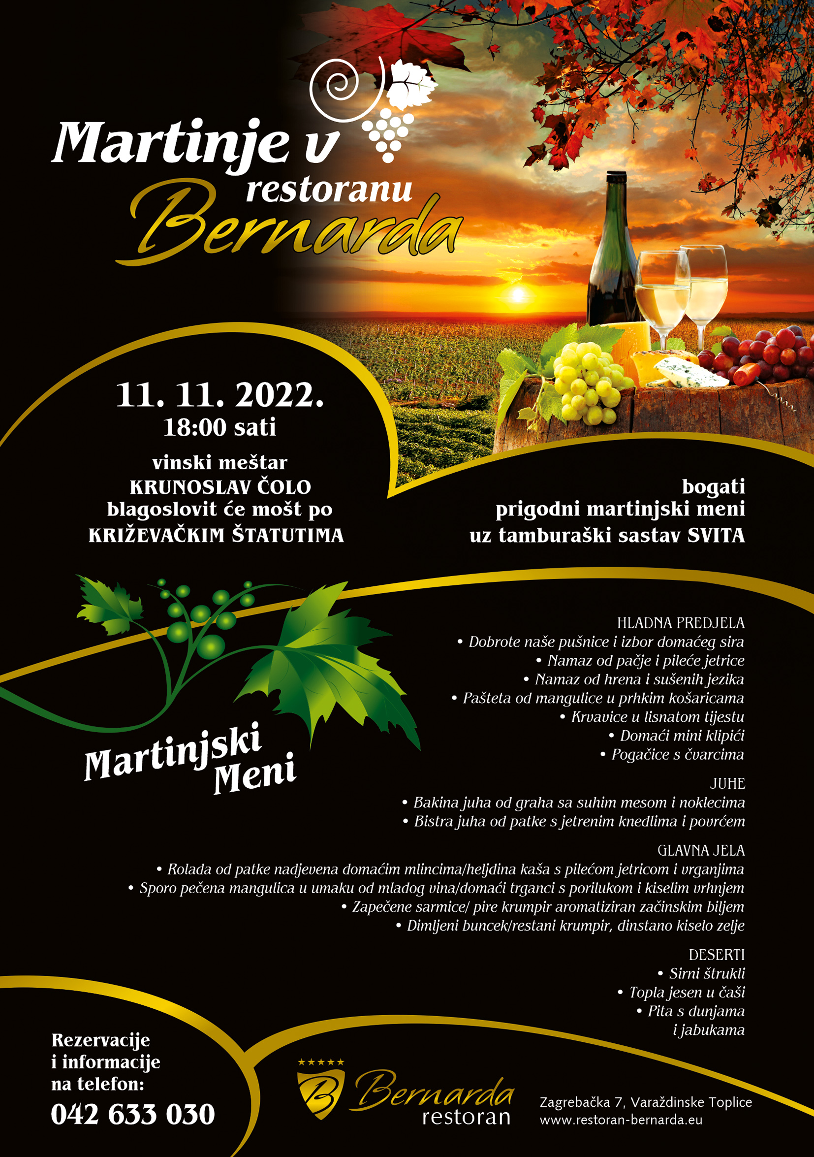 Za ovogodišnje Martinje restoran Bernarda u Varaždinskim Toplicama priređuje posebnu dobrodošlicu svojim gostima, pridružite se i vi jer bit će tu posebna špelancija uz krštenje mošta koju će izvesti Krunoslav Čolo, a osim vina goste restorana očekuju i posebni meniji. Zabave neće nedostajati, a što će sve biti ponuđeno na stolu pogledajte na letku na slici. Cijene su umjerene, a ponuda je kao uvijek do sada raskošna.