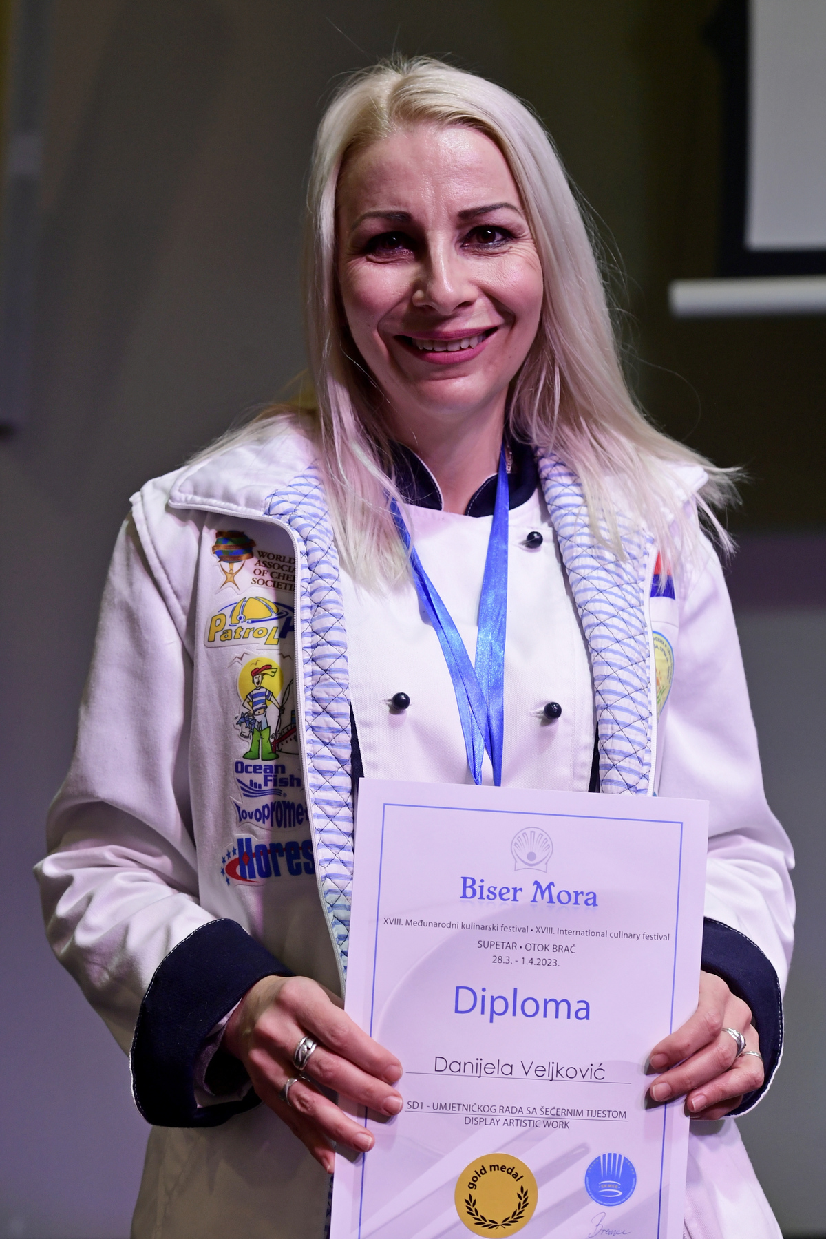 "Dolazim iz Niša, a po zanimanju sam slastičar, a natječem se dugi niz godina. Izradila sam Gucci stvari od šećerne paste, a trebalo mi je 20-ak dana rada na ovim slatkim eksponatima. Lani sam bila na Biseru moru, a ovakvi radovi su vrlo cijenjeni, u svijetu su najjači u ovakvim disciplinama Turci, a mi smo dosta samouki, no trudimo se" – kazala je Veljković.