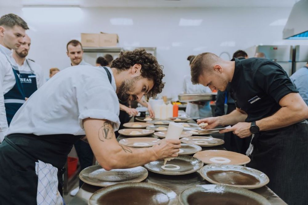 Uz chefa Matiju Bogdana, za sjajno gourmet putovanje pobrinuli su se i gostujući chefovi Hrvoje Zirojević i Stiven Vunić, koji su gostima pripremili hladni čaj od kamenice i gina te brancina s mladim kupusom i Berrue Blanc umakom. Ukusna jela trojice chefova bila su popraćena pomno biranim vinima i pjenušcima iz vinarija Matošević i Gospoja te signature koktelima koje je pripremio poznati hrvatski barmen Filip Pleteš.