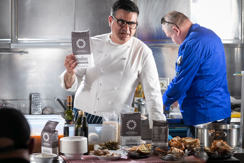 Chef Ino Kuvačić prvog je dana manifestacije Biser mora predstavio talijanske riže margherita u rižotu od jadranskih škampa, marinirane trlje i motra, a recept ćete pronaći na kraju teksta. Prisutni su se mogli upoznati sa najboljim vrstama i tehnikama kuhanja riže sjeverozapada Italije s tradicijom od 1904. godine.