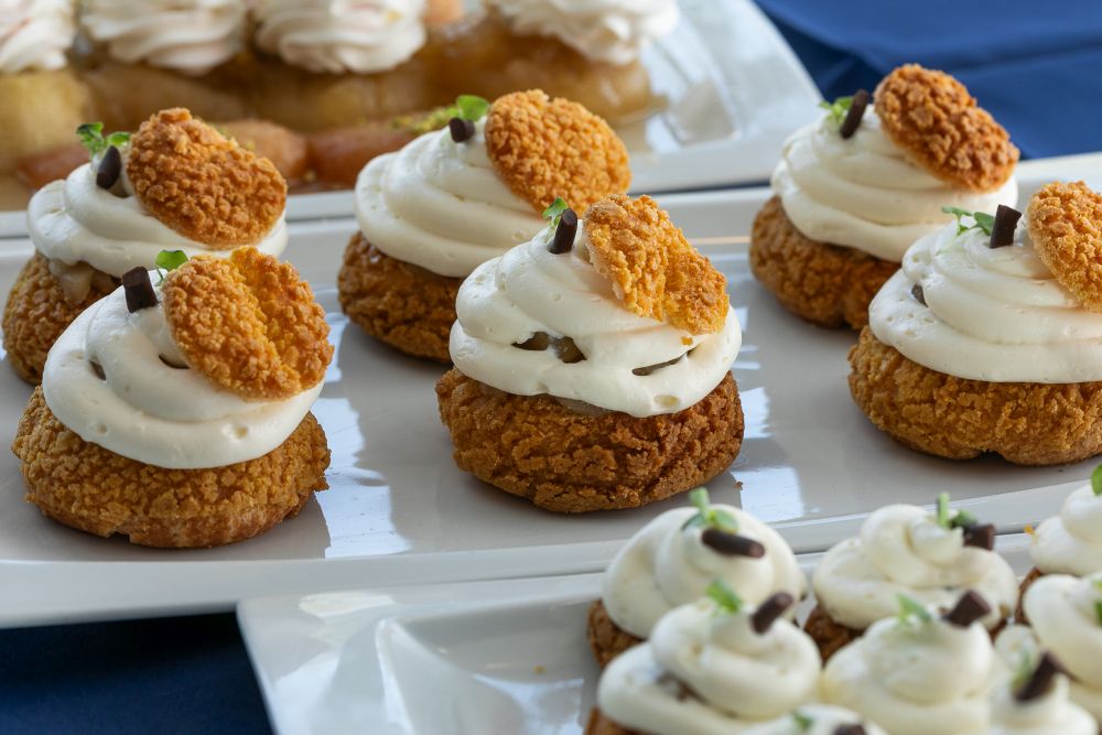 Slaganje deserta: pečenom pate choux s cracquelinom izrezati vrh i napuniti s kompotom od jabuka i hrskavim insertom od oraha, dekorirati sa šlagom