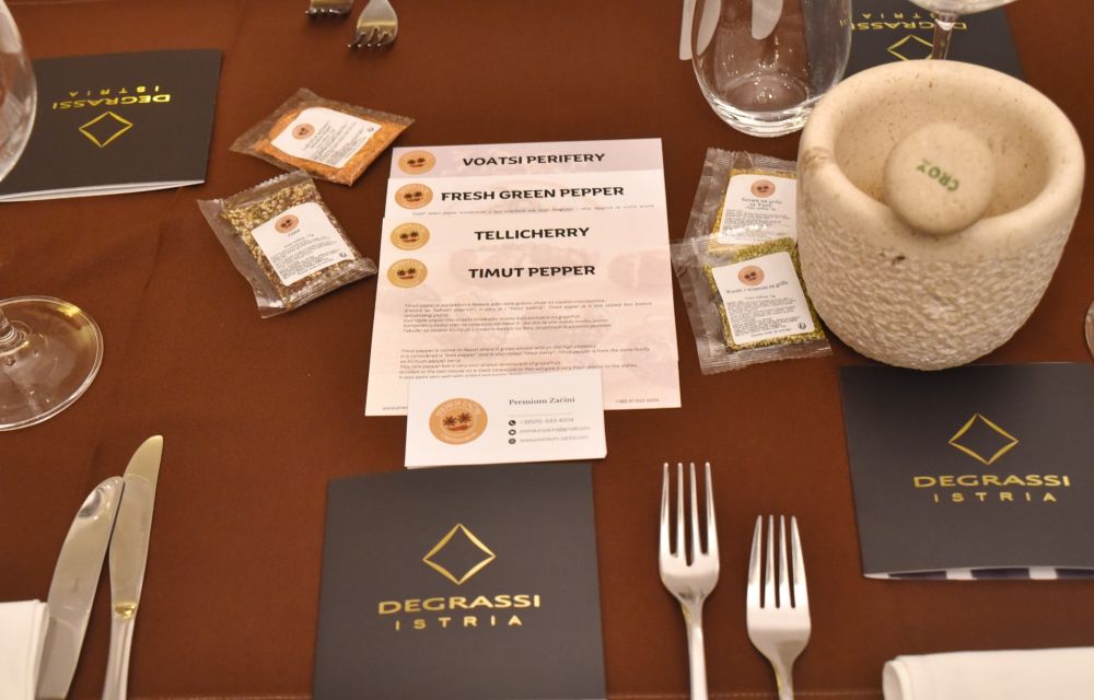 U Zagrebu održana je večera sljubljivanja vina i papra. Četiri vina Degrassi, linije Special Edition Contarini, spojena su s odabranim vrstama papra tvrtke Premium začini. Priču o papru, o podrijetlu i terroirima ispričala je Alessia Cortesi, vlasnica marke Premium začini iz Zadra, naglasivši da je njezin projekt pokrenut tek , 2023. sa željom da se vrhunskim domaćim namirnicama u Hrvatskoj ponude novi okusi Među vrstama papra najpoznatiji je i najviše korišten crni papar, u 16.stoljeću zvan crnim zlatom jer mu je cijena bila poput cijene grama zlata pa se papar koristio kao valuta. Crni papar raste samo u tropskoj klimi, a svaki papar ima posebne značajke i njemu su, kao i vinu, važni i terroir i klima! Posebni terroir Contarini na bijeloj zemlji Bujštine, ali i posebno dobra godina, 2016., bile se povod da Moreno Degrassi, istarski vinar, nekim vinima da posebnu etiketu i novi naziv linije. Na večeri papra i vina, Moreno Degrassi predstavio je tri vina iz iznimne berbe 2016. godine: Cabernet Sauvignon, Cabernet Franc, Pinot Noir, a četvrto, Petit Verdot, bilo je iz 2015. Te su godine pružile vrhunsku „sirovinu“ za odležavanje – tako da su vina stvorila novu liniju Special Edition. Za ta četiri crnjaka posebno su se dizajnirale etikete.