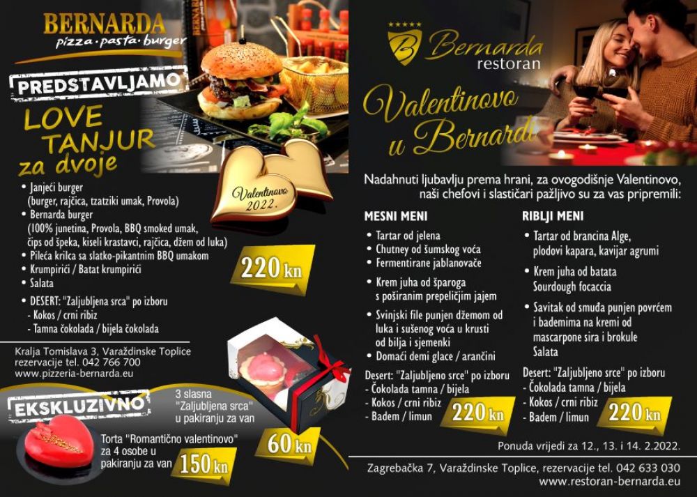 Uz Valentinovo u restoranu Bernarda u Varaždinskim Toplicama slastičari i chefovi su za vaš romantični izlazak u dvoje priredili ljubavlju nadahnute menije.