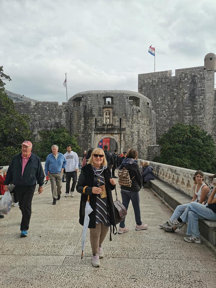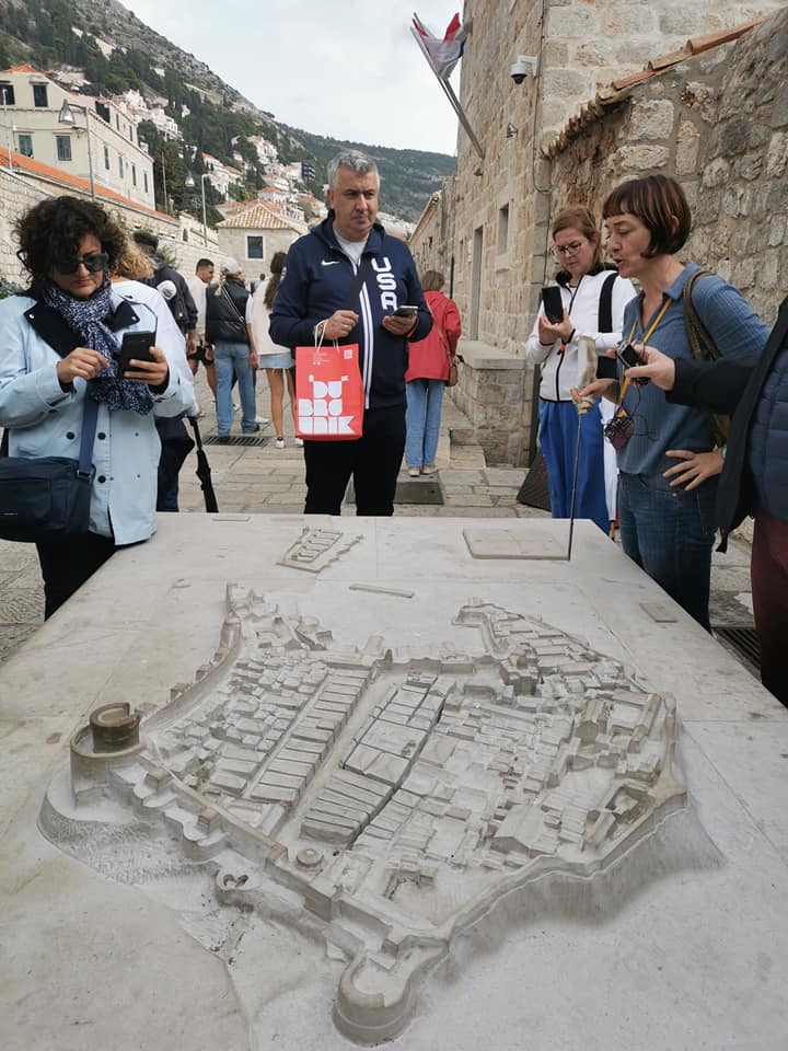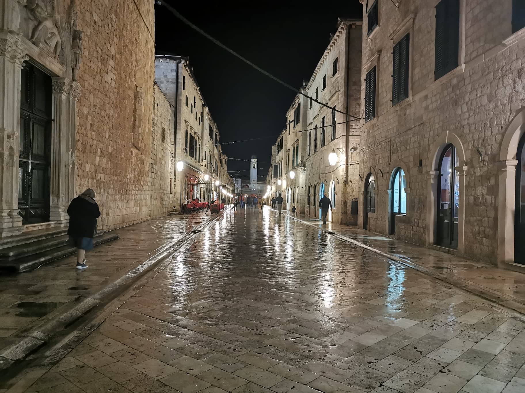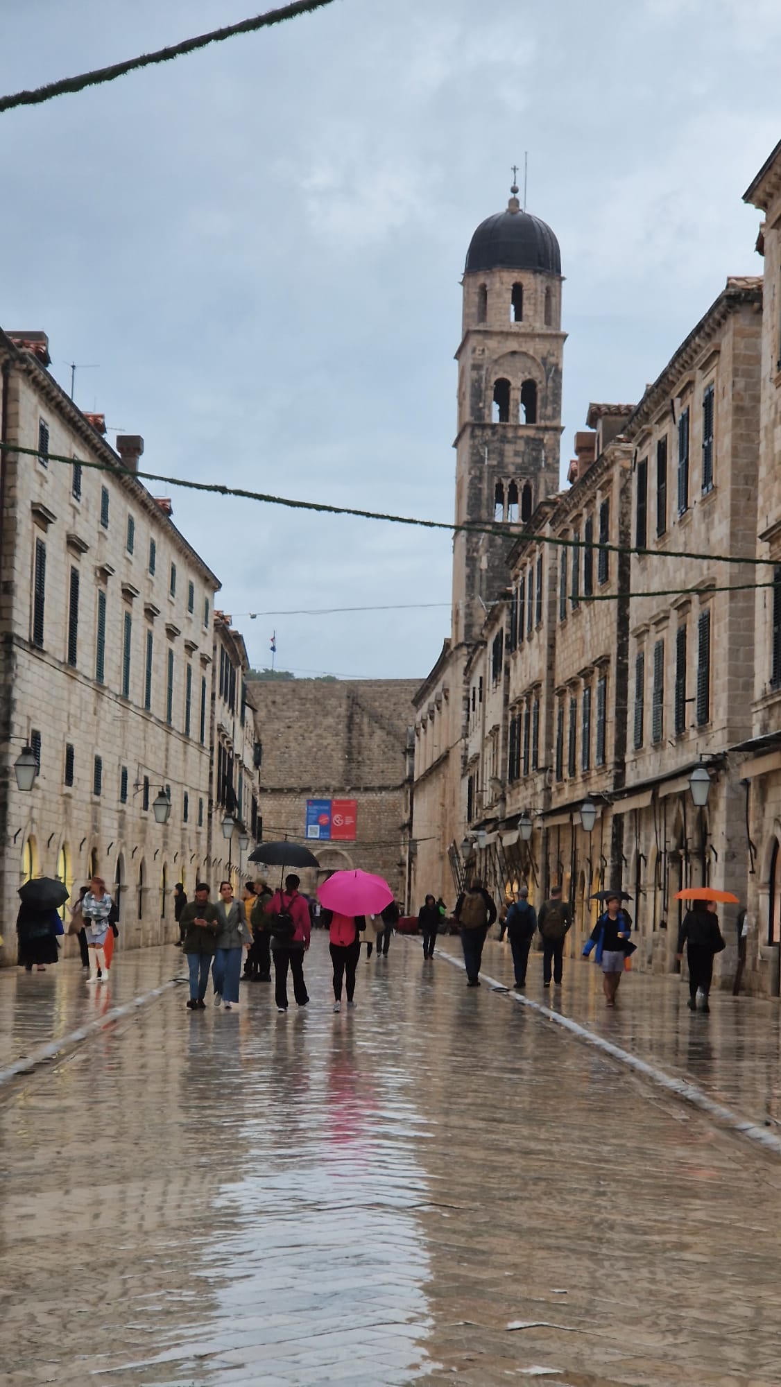 U Dubrovniku smo se popeli na gradske zidine odakle se pogled pruža na kule, crvene krovove kuća te uličice i trgove staroga grada pa sve do gradske luke i velikog plavetnila s otocima Lokrumom i Elafitima. Na Stradunu okupanom kišom sve je vrvjelo od turista s cruisera. Zelenci su dvaput ponovili svoj zvon označavajući puni sat. Putem smo razgledali Onofrijevu česmu, Gundulićevu poljanu, Palaču Sponza, Crkvu svetog Vlaha, Knežev dvor, Kazalište Marina Držića…