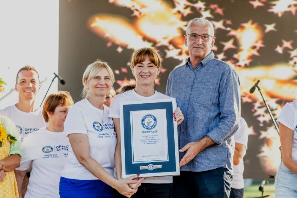 Kada je sudac iz Londona proglasio rekord nastalo je opće zadovoljstvo . Najduža linija štrudli na svijetu iznosi 3136,84 metara, a činilo ju je 8940 komada štrudli.