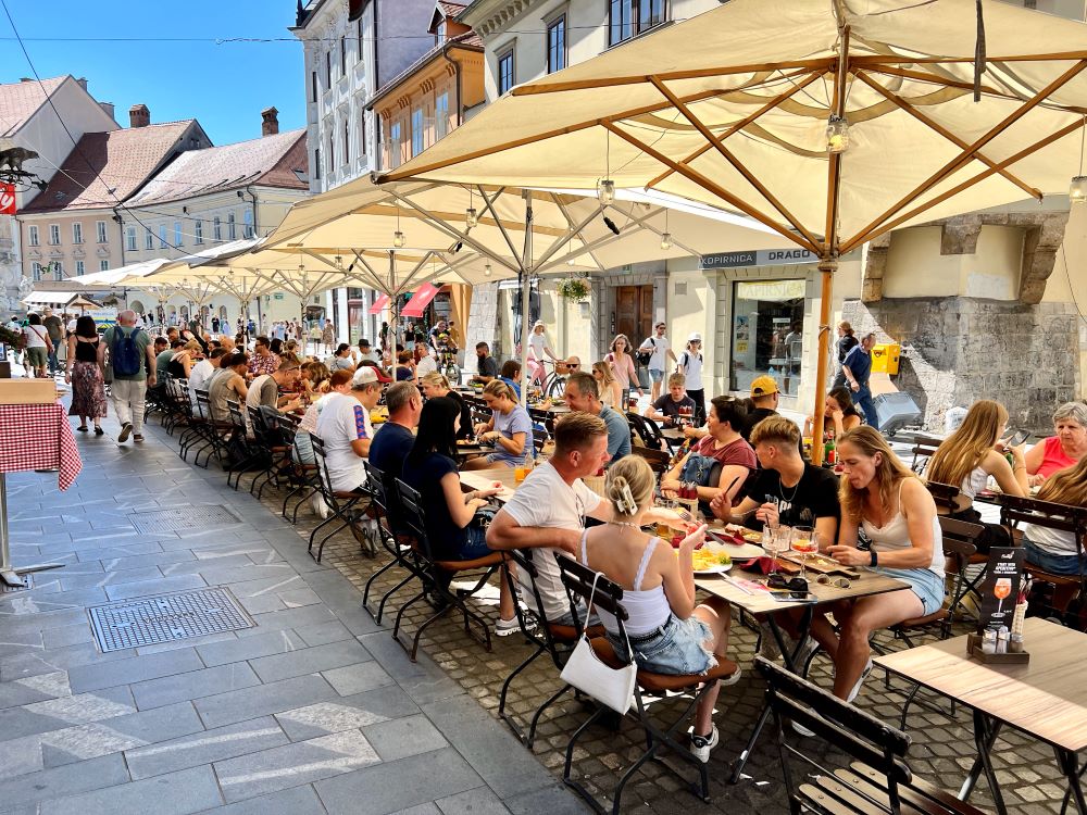 Rekoh, i tržnica je vrlo zanimljiva iako su zgradu danas zauzele specijalizirane trgovine, ugostiteljski lokali i suvenirnice. I stotine stranih turista budući da su Ljubljana i Slovenija veliko otkriće i proglašeni raznim naslovima poput najčistijeg grada, najljepše države i slično. No, nećete biti uskraćeni za voće i povrće čije su stojnice preko puta s ponudom brze hrane. Kako su zgrada i arkade tržnice uz samu rijeku Ljubljanicu možda se odvažite na plovidbu nekim od malih i lijepih turističkih brodova? A ako niste ljubitelj plovidbe, s obližnjeg Tromostovja krenite njenom desnom obalom kako biste nešto prezalogajili ili popili u nekom od niza pizzeria, bistroa, gostionica ili restorana. I lijeva obala je zanimljiva, ali to ostavljam za neki drugi obilazak.