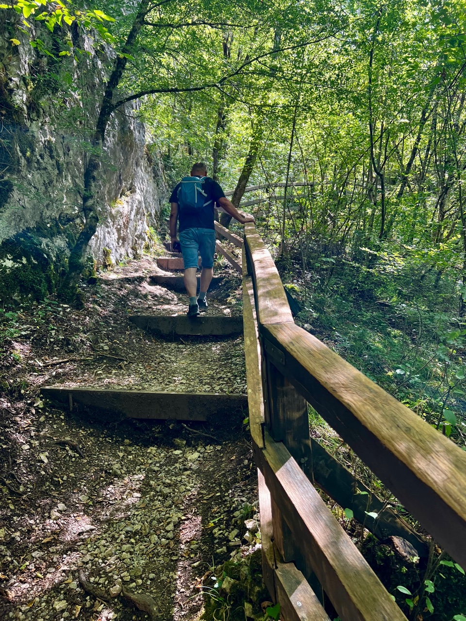 A onda slijedi 15-minutni uspon (nekima treba i dvostruko) zahtjevnom stazom do neopisive ljepote izvora Une. Prvo se kreće širokom zavaravajućom stazom uz mirni tok rijeke Une, a onda kod prvog slapa slijedi početak penjanja uskom stazom, najčešće nedovoljno širokom da se mimoiđe dvoje ljudi. S jedne strane gotovo okomite stijene planine, s druge mnoštvo drveća što skriva pogled na bučnu Unu od koje me odvajaju drveni rukohvati kako se ne bih strmoglavio u nju. Uspon mi sve teže pada i zbog stuba ponekad visokih gotovo pola metra (barem u mojoj glavi), ali i što hodam po neravnim kamenim izbočinama. Razmišljam hoće li me sustići hiperventilcija za koju sam često čuo, ali srećom nikad doživio. Spašava me kratak ravan dio s lijepim odmorištem pa spuštanje po puno pristupačnijoj stazi. A onda nakon petnaestak minuta „patnje“…
